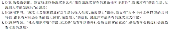 现实主义的格局与气质 梁鸿鹰 古今中外文艺家的长期实践,使现实主义创作方法与精神气质被广为认可,这种认可不是靠外部力量强加的。现实主义一直在发展中丰富,它与任何一种创作方法一样,在接受着时间和实践的考验。对现实主义而言,只不过因为存在时间长,经受的检验就格外多,但在赞扬和质疑、拥护和反对中,反而不断增添着它的艺术光彩。 创作的梏局决定着创作的水平。格局小,力量就弱;格局大,就能够深入人心,格局来自胸怀,与视野密切相关。古今中外文学巨匠的共同特征,是具有对社会生活的强大包容、涵盖能力。任何一个伟大的现实主义作家都不可能把自己局限在自我的牢笼里,他们首先需要心里有他人,需要胸怀一个完整的外部世界,心里装着整个宇宙,因而心里就容不下功利的盘算,进而看得更远、更开阔。 但同时,伟大的现实主义经典之所以与假大空、概念化、抽象化势不两立,还在于能够在具体创作中落“小”。伟大的现实主义作品总是能够让思想从细节中自然而然地流露出来、通过对人的生存、对一切情感的细枝束节进行“事无巨细”的描绘,以足够丰沛的生活原貌表达对社会的认识。真正的现实主义大家是生活细节的收集者,在别人忽略的地方开掘出题材的富矿,在作品中建造起细节的迷宫,让人性的多棱镜发出光彩。现在不少作品达不到现实主义的高度,更多的时候可能不在于选材不好、立意不高、志向不大,而在于没有立足于细致入微的表达。这样的作品即使书名被记住了,但没有一个细节能留在人的头脑中,更谈不上有助于丰富人们的内心世界、提高人们的精神力量。 现实主义强调忠实于现实生活,需要作家、艺术家按照生活的本来面目反映现实,但更强调透过现象看本质,以理想照亮现实,启迪人,引领人。当前文艺创作有“高原”缺“高峰”,不单单指艺术高峰的缺乏,也包括“真实”的缺乏、思想价值高度的缺乏。现实主义的“实”常常表现为直面现实存在的复杂性、矛盾性,对社会进行由表及里的调查、探究,从而冷峻地解剖生活,目光如炬地见他人之未见,以引起疗救的注意。 目前不少作品引不起社会的关注,在于多是浮光掠影地描写现实表层,没有触摸社会进步发展的真正脉搏,没有捕捉到变革中人心向上的深层律动,因而不免陷入庸俗化,流于表面化,难说有真情实感,难为社会提供有益的精神价值。究其原因是创作者没有深刻理解现实主义的精髓,没有学到拨开社会历史迷雾的真经,导致对重大社会问题的失语,自然不会产生强大的社会效应。 文艺之所以有助于人的精神成长,在于能够树立标尺、指明理想,由现实落笔,再超拔于现实之上。人们之所以认为作家、艺术家的工作不是手艺,不是职业,而是一种使命,就是因为他们具有提升人们对社会历史认识的本领,人们推崇的正是文艺化腐朽为神奇,将生活经验上升为精神启示力量的深刻担当。 1.下列关于原文内容的表述,不正确的一项是 A.现实主义的创作方法与精神气质能够被广为认可,主要得益于古今中外文艺家的长期实践。 B.一个人要成为伟大的现实主义作家,需要的不是以自我为中心,而是要能够心中装着整个世界。 C.现实主义解剖生活,发现别人不能发现的生活本质,所以它能直面现实存在的复杂性和矛盾性。 D.由现实落笔又超拔于现实,给人树立标尺,指明理想的文艺作品对人的精神成长会有帮助。 2.下列理解和分析,不符合原文意思的一项是 A.现实主义和其他创作方法都要接受时间和实践的考验,只不过相比较而言,现实主义所经受的考验格外多。 B.创作格局跟一个人的胸怀、视野有关,也决定着一个人的创作水平,现实主义作家都具有对生活的强大包容、涵盖能力。 C.经典的现实主义作品在创作中能够落到“小”处,而现在不少作品达不到现实主义的高度,原因往往在于表达不够细致入微。 D.作家、艺术家的使命感体现在提升人们对社会历史的认识,将生活经验上升为对人们具有启示作用的精神力量。 3.根据原文内容,下列说法不正确的一项是 A.现实主义在发展中受到了赞扬和拥护的同时也遭受到了质疑,甚至是反对,但这些却不断增添着它的艺术光彩。 B.现实主义大家往往收集生活细节,一般人都忽略的地方也能发现题材,能用细致入微的表达把作品的细节留在读者的头脑中。 C.目前不少现实主义作品只是简单描写现实,陷入庸俗化,主要是因为作者对现实主义精髓理解不够透彻,社会知识不够。 D.现实主义强调忠实于现实生活,体现在按生活的本来面目反映现实和透过现象看本质两个方面,其中第二方面更重要。 参考答案 1、C 因果关系倒置 2、B 范围不当 3、C 理解有误