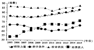 17.下面是华东师范大学教育学部根据调研编制的《2005—2015义务教育各项资源指数【注】》图表,请根据图表内容,用简洁的语言把图表反映出的内容补充完整(不要出现具体数字),不超过60个字。(6分)