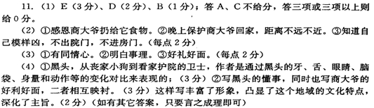 (选自2015年第4期《收获》) (1)下列对这篇小说思想内容与艺术特色的分析和鉴赏,最恰当的两项是(5分) A.论模样,黑头太丑,白底黑花,花像烂墨点子,让人恶心;壮实后“白牙更尖,红舌更长”,但既不咬人,也不吓人,让人觉得很安心。 B.商大爷是个敦厚老实的汉子,从小当学徒当伙计,知道世道的艰辛,一看见四处流浪、瘦得可怜的黑头就动了心,模样丑不丑根本不碍事。 C.小说以黑头撞死作为结局,既在意料之外,又在情理之中,不仅呼应了黑头闯祸后离家出走 的悬念,还彰显了商大爷的粗暴和自私,颇具艺术匠心。 D.小说描写细致传神,黑头认真地看家护院,想做报效有恩于自己主人的好狗却不可得,被误解,被驱赶,直至一头撞死,期间的内心挣扎,让人唏嘘不已。 E.发生在黑头和商大爷之间的故事既温馨又伤感,对黑头除了同情却又不得不肃然起敬,其中也蕴含着作者对当时社会伦理道德的忧虑与反思。 (2)商大爷常说黑头“懂事”,知道怎么“做事”,这表现在哪些方面?请简要概括。(6分) (3)小说在刻画商大爷这个形象时,突出了他的哪些特征?请简要分析。(6分) (4)小说中有一些看似不经意的对比与映衬,请结合小说内容找出一两处进行具体分析,并说明这样写有什么效果。(8分) 参考答案