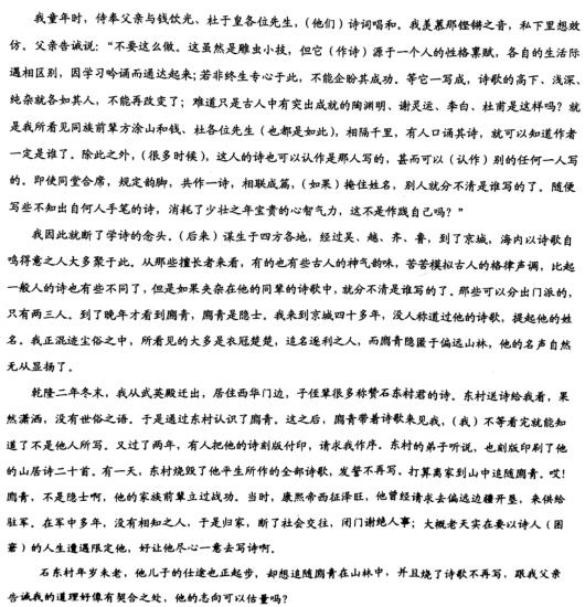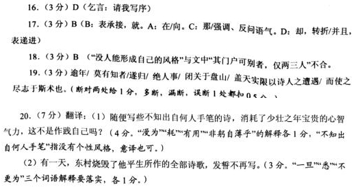 廌青山人诗序 方苞 苞童时,侍先君子与钱饮光、杜于皇诸先生,以诗相唱和,慕其铿锵,欲窃效焉。先君子戒曰:“毋以为也!是虽小道,然其本于性质,别于遭遇,而达以学诵者,非尽志以终世,不能企其成,及其成也,则高下浅深纯驳,各肖其人,而不可以相易;岂惟陶、谢、李、杜峣然①于古昔者哉!即吾所及见宗老涂山及钱、杜诸公,千里之外,或口诵其诗,而可知作者必某也。外此,则此人之诗,可以为彼,以遍于人人,虽合堂同席,分韵联句,掩其姓字,即不辨其谁何,漫为不知何人之诗,而耗少壮有用之心力,非躬自薄乎?” 苞用是遂绝意于诗,而自餬口四方,历吴、越、齐、鲁以至都下,海内以诗自鸣者多聚焉。就其能者,或偏得古人之气韵,苦橅其格调,视众人亦若有异焉,然杂置其伦辈中,亦莫辨为谁何。其门户可别者,仅两三人。至晚岁乃得廌青。廌青,山人也。余往来京师四十余年,未有道其诗与名字者。盖余方混混尘俗中,所见多衣冠驰骛之士,而廌青匿迹于穷山,其声光自莫由而达也。 乾隆二年杪冬,余自武英殿出居西华门隅,子侄辈多称东村石君之诗。东村以诗投,果萧洒无世俗人语,遂因东村以得廌青。其后廌青以诗来,不待终篇,而知非他人作也。又二年,或锓其诗于版,乞言于余。东村之门人闻之,亦刻其山居诗二十首。东村一旦悉焚平生所作,誓不更为,而谋去家以从廌青于山中。噫!廌青,非山人也,其家世勋旧,方圣祖仁皇帝西征泽旺,尝自请赴绝塞开垦,以给屯军。逾年莫有知者遂归绝人事闭关于盘山盖天实限以诗人之遭遇而使之尽志于斯术也。 东村齿未艾②,其子仕进方得路,而欲从廌青于山中,且焚诗而不为,与先君子所以戒苞者似有合焉,其志可量也哉! 注释:①峣然:山高峻的样子,这里指在古人中成就突出。②齿未艾:年岁未老。 16.对下列句子中加点词语的解释,不正确的一项是 A.及其成也,则高下浅深纯驳,各肖其人 驳:驳杂 B.苦橅其格调,视众人亦若有异焉 视:比较 C.所见多衣冠驰骛之士 驰骛:奔走趋附 D.或锓其诗于版,乞言于余 乞言:求助 17.下列各组句子中,加点词的意义和用法相同的一项是 A.岂惟陶、谢、李、杜峣然于古昔者哉 故燕王欲结于君 B.外此,则此人之诗,可以为彼 则群聚而笑之 C.其门户可别者,仅两三人 其孰能讥之乎 D.其子仕进方得路,而欲从廌青于山中 君子博学而日参省乎己 18.下列对原文的理解与赏析,不正确的一项是 A.作者“绝意于诗”是受了父亲的影响,认为诗虽为“小道”,却非人力可强为,能形成自家面目更非易事,不必耗费太多精力。 B.作者为谋生而游历各地,也的确见到过一些能模仿古人气韵格调的能手,但是仅擅长声律辞章而已,没人能形成自己的风格。 C.文章写自己父亲的告诫,阐明自己不写诗的一个原因是难以形成自家面目,为下文张本,从而衬托廌青诗歌的难能可贵。 D.文中写石东村的诗歌独具个性,又写亿烧掉了自己的全部诗作,要去追随廌青,这样写从侧面表现了廌青山人的诗歌成就。 19.用“/”给文中画波浪线的部分断句。(3分) 逾年莫有知者遂归绝人事闭关于盘山盖天实限以诗人之遭遇而使之尽志于斯术也。 20.把文中画线的句子译成现代汉语。(7分) ⑴漫为不知何人之诗,而耗少壮有用之心力,非躬自薄乎?(4分) ⑵东村一旦悉焚平生所作,誓不更为(3分) 参考答案 16.D 17.B 18.B 19.逾年/莫有知者/遂归/绝人事/闭关于盘山/盖天实限以诗人之遭遇/而使之尽志于斯术也。 20.(1)随便写些不知出自何人手笔的诗,消耗了少壮之年宝贵的心智气力,这不是作践自己吗? (2)有一天,东村烧毁了他平生所作的全部诗歌,发誓不再写。 ![]() 参考译文
