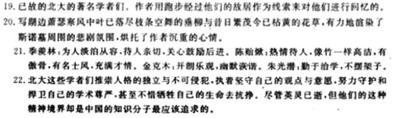 我怕惊动湖畔那些精灵 谢 好久没来这湖边了。我拣这一年的最后一天来这里跑步,为的是重温往日的记忆。这湖是我的最爱,我生命的大部分已弥散于此。常居昌平之后,我总找机会回来,回来一定找机会到湖滨跑步,这已是我数十年的习惯了。这里的一草一木都有记忆,也都会说话。我脚步轻轻,怕惊动那些沉睡湖畔的精灵。 我有自己的跑步路线。从住处畅春园出发,进西校门,过鸣鹤园小荷花池,绕池一周。经民主楼、后湖,入朗润园。紧挨着路边,出现一座小院,正房住着温德先生。温先生终身未娶,中国是他永久的家。温德先生是闻一多先生的朋友,当年闻先生“引进人才”,一引就是终身。 我跑着,想着。眼前就是十三公寓——季羡林先生的家到了。那边窗户里深夜的一盏灯,是朗润园的一道风景。那灯光我是熟悉的,因为我和季先生曾是邻居,我住过十二公寓。记得那一年,火焚一般的夏天过去了,好像是秋风萧瑟时节,已是落叶满阶。那日在朗润湖边遇见先生。久别重逢,他关切地问:“还写文章吗?”我答:“还写,但不能发表。”先生意态从容,沉吟片刻,说:“那就藏诸名山吧!”我们相对无语,淡淡的,在我,却是如沐春风。 由此向东,是十二公寓了。情景如昨,也是冬天,湖水凝冰。透过湖面薄雾,依稀是儿子正在滑动他的冰车。迷蒙中我欲唤他,却是伤痛攻心,遂止。想起那厢住着吴组缃先生,他是直接教我的,我要向他执弟子礼。陈贻焮先生住在吴先生的楼下,他也是从镜春园搬来的,不仅搬来了他的书房,也搬来了那边的竹林。先生有名士风,爱竹。先生一如既往地欢迎我,一如既往地款我以香茗,与我谈诗论文,也一如既往地展示他湘人的傲骨、湘人的才情。 朗润园四围环水,有石桥通往内园。岛内崖畔,镌有季羡林先生手书“朗润园”三字。整座园子清朗温润,宛若一块浮于水中的美玉。此刻冬寒,花事式微,已是满眼枯瘦,只能于记忆中寻找旧时芳华。此刻这一带枯水寒山,一路唤起我的记忆,有欢愉,也有无尽的怀想。金克木先生的家我是去过的,也是那年夏季过后,风雨萧疏中大家都很寂寞,我在北大想约请学界纯正人士,谈些那时已被冷落的学术。约请金先生出席,电话那头传来的声音爽朗而诙谐:“不行啰,我现在除了嘴在动,其他的都不能动了。我已是半个八宝山中人了!哈哈……” 从朗润、镜春两园逶迤向西,林间山崖,婉转隐约,顷刻间未名湖展开了它冰封的湖面。湖滨柳岸萧瑟,叶已落尽,空有枝条在寒风中摇曳。沿湖小道两旁,昔日葳蕤的花草也已枯黄。这边是斯诺墓,这位充满爱心与正义的美国人,选择这里的一角长眠。那年也是在清晨,也是在这里,晨曦中但见朱光潜先生在练拳。趋前请安,先生告诉我,这套拳法是他自编的。80年代,先生还未退休,身材精干,脸色红润,双目炯然。那时他正在紧张地翻译维柯的《新科学》。他是康健的,记得当年英国一剧团来华演出莎士比亚戏剧,朱先生挤公共汽车去展览馆看戏,一时引发舆论热议。 临湖轩优美地隐藏在竹林中。竹子呈青绿色,有点暗,带着与霜冻抗争的痕迹。这里曾是司徒雷登校长的住所。据说冰心先生的婚礼是在临湖轩举行的,司徒雷登校长主持了她的婚礼。此刻竹影婆娑,似乎参加婚礼的人们还沉浸在昨夜美丽的满是香槟和鲜花的回忆中。对于司徒雷登而言,这里当然也是他最不忍离开的地方。我选择这一年的最后一个清晨,向至今还活泼泼地生存在这里的精魂致敬。我怕惊动他们,蹑着脚步,又不免沉重,因为这方土地的负载太沉重了。 绕湖一周,习惯性地回到了燕南园,这是我从学生时代就隐秘地钟情的地方。院子不大,内涵却深厚,花径弯曲,总觉绵长无尽。三松堂人去楼空,三棵“院树”依然凌寒而立,发出严寒中凝聚的苍绿的光焰。周培源先生的家就在近旁,那日我陪徐迟先生拜访他,在他的书房聆听他关于湍流的论说——周先生到最后都没有同意三峡工程。 燕南园集中了燕园最瑰丽的风景,他们劳作过,思想过,快乐过,也痛苦过。他们以自己的方式表达自己的意愿,作为学者,他们的人格是独立的。一旦有人试图改变他们的生活方式,或者试图摧毁他们的学术尊严,温文尔雅的他们,也会以自己的方式抗争。燕园的居民都记得,历史学家翦伯赞先生及其夫人,曾经以最断然、也最惨烈的方式把自己写进了历史。尽管我的脚步轻轻,但我还是触动了历史最敏感的一页,我还是惊动了那些曾经爱过,曾经痛过,曾经辛劳过,也曾经幸福过的灵魂。 (选自《中华读书报》,有删改) 19.文中“沉睡湖畔的精灵”指什么?文章是用什么线索写及他们的?(4分) 20.请简要分析第6段中画线语句的作用。(4分) 21.请结合文本分别简要概括季羡林、陈贻焮、金克木、朱光潜先生的性格特点。(4分) 22.最后一段说:“他们以自己的方式表达自己的意愿,作为学者,他们的人格是独立的。一旦试图改变他们的生活方式,或者是试图摧毁他们的学术尊严,雍容尔雅的他们,也会以自己的方式抗争。”谈谈你对这句话的理解。(6分) 参考答案 ![]()