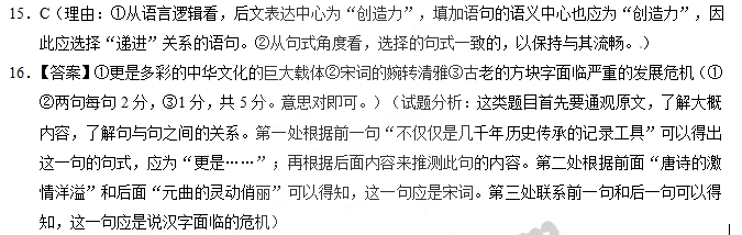13.C(南辕北辙:指行为与目的相反。背道而驰:指方向与目的相反,含贬义。大相径庭:指看法、意见等相差很 远。三个词语均有相差很远的意思,①中的“秀肌肉”是一种行为,故“南辕北辙”最合适;②中明确说路线, 只能填“背道而驰”,为贬义;③只能填“大相径庭”) 14.D(解析:A项,成分残缺,应在“全媒体时代” 加上“的来临”。C项,“目的在于为了唤醒人们对历史的记忆”句式杂糅,改为“目的在于唤醒人们对历史的记忆”或“是为了唤醒人们对历史的记忆”。D项,不合逻辑。) ![]() 17.参考:如果把人生比作天空,那么,便有阴晴变化,日出日落,云卷云舒。如果把人生比作大地,那么,便有高低起伏,潮涨潮落,风生水起。 18. “微信发红包”的有限进步与无限期待 “微信抢红包”很多人喜欢玩,老师因为上课给学生发微信红包,是个稀罕事。扬州工业职业技术学院经济管理学院焦世奇的这个“新招”,让学生没有一个翘课,课堂气氛活跃。而且,他的班级,师生关系好到爆表,他担任班主任的班级,很多学生叫他“老大”。(10月26日《扬子晚报》) 作为一种社会联结手段,“微信抢红包”极大地促进了社会互动。在通常情况下,微信是一个发展非功利性社会关系的场所,是一种私人关系;然而,“教师发红包”则是一种公共关系,将其作为一种调动学生积极性的工具。在利益主体多元化、价值观念多样化的当下,“教师发红包”不可避免会引发观点碰撞。 在高等学校“重科研轻教学”的评价机制下,一些教师在课堂外忙得不亦乐乎,在课堂教学上却没有投入足够的心思和精力。“教师发红包”既让我们看到了一位教师的责任与担当,也让我们看到了高等教育的转型和创新——在信息技术幅度跨越式发展的当下,社会不再像过去那样需要大量的“知识拷贝型”人才,而是更多地需要具有“互联网+”思维的人性化、创新型人才;这一切,都在倒逼高校的课堂教学实现结构性、革命性变化。 翘课已经成为一种见怪不怪的常态也好,课堂“低头族”随处可见也罢,当课堂教学不能满足当代大学生的利益诉求,他们便“用脚投票”。身处变革时代,如果高校教师依然在陈词滥调中打转,依然在改革创新中趑趄不前,依然在批评质疑中自说自话,自然难以“实现价值、发挥作用、赢得尊重”。 “教师发红包”作为一种激励机制,有利于增强师生互动。对那些出勤率高、学习成绩好、上课认真的同学“另眼相看”,有助于破解“搭便车困境”,提升课堂的生机与活力。只不过,“教师发红包”治标不治本,即使能在短期内取得成效, 也难以从根本上改进课堂教学。当学生们失去了新鲜感,当教师的经济压力越来越大 ,“教师发红包”难免会陷入进退维谷的尬尴境地。 课堂教学要想赢得大学生的喜爱,不仅需要教师的尽职尽责,也需要信息技术手段的支撑,以及学校在环境创新、模式创新、评级创新、资源建设创新等方面的支撑。如果仅仅依靠“教师发红包”的个体救赎,却不从根本上改善生存生态,课堂教学就会缺乏吸引力和竞争力。 拉近师生之间的距离感和隔阂感,增强师生互动,“教师发红包”只是一个好的开始。提升高等教育质量、增强课堂教学,不仅需要教师的个体善意,更需要系统的、综合性的教育转型与创新。只有这样,课堂教学才不会为学生逃课发愁、犯难。