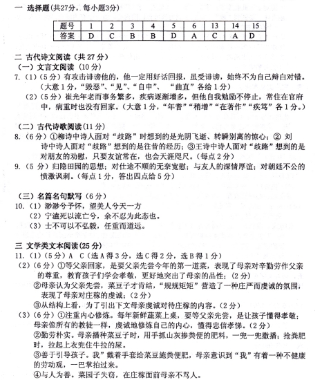 第Ⅱ卷表达题 五、语言表达题(20分) 13.依次填入下列各句横线处的成语,最恰当的一组是(3分) ①相比于持续火爆的住宅楼市场,多年来,写字楼市场一直处于____的状态,与同地段的住宅楼相比,价格原本应该高出很多的写字楼,现在仅仅是略高而已。 ②大儿子住得很远,工作也忙,难得回来—趟,____,老王想管也管不了他。③诚实守信,____,历来都是中国人的传统美德,是公民道德规范的基本要求,是现代社会文明的基石. A.不温不火 B.不瘟不火 C.不温不火 D.不瘟不火 14下列各句中,没有语病的一句是(3分) A.即便网传的延迟退休时间表是假的,官方也不妨听一听背后公众关于延迟退休的真诉求。 B.一些法大校友和网友对邓亚萍任职法大提出质疑,也有网友认为以邓亚萍的学历和成就有资格获聘。 C.普京披露,俄军已经向“叙利亚自由军”提供空中掩护、武器弹药及物资,促成这支叙反对派武装力量与叙政府军“合力”反攻“恐怖分子”。 D.为保护公众健康,减缓大气污染程度,北京市空气重污染应急指挥部于12月7日18时30分发布空气重污染预警等级由橙色提升为红色的消息。 15.填入下面一段文字横线处的语句,最恰当的一句是(3分)博富科技股份有限公司联合上海加冷松芝汽车空调股份有限公司针对汽车空调臭味问题,提出了新的解决方案。这家公司开发的纳米无机抗茵材料,____,不仅为车内、室内空调系统提供了包括空调管道、空气滤清器以及蒸发器的系统解决方案,还可以用于解决家用和工程空调系统的异昧问题。 A.彻底攻克了由细菌、霉菌产生的空调臭味问题,并将独特的纳米材料和高分子涂层技术有效结合起来 B.将有效结合独特的纳米材料和高分子涂层技术,因而会攻克由细菌、霉菌产生的空调臭味问题 C.一旦将独特的纳米材料和高分子涂层技术有效结合,就会彻底攻克由细菌、霉菌产生的空调臭味问题 D.将独特的纳米材料和高分子涂层技术有效结合,彻底攻克了由细菌、霉菌产生的空调臭味问题 16.在下面一段文字横线处补写恰当的语句,使整段文字句意完整连贯,内容贴切,逻辑严密。(6分) “安”是一种人生的智慧,是一种更高境界的生活方式。如今的人们,过多地被物质迷惑了双眼,越发不安分起来了。世人只有安于现状,看清自己真正追求的是什么,① 17.阅读下图,分析我国北方沙尘暴天气的趋势,在下面的横线上补写一段说明文字,证明题中的观点。(5分) ![]() 未来北方沙尘暴可能会进入波动式缓慢增加的时期。据国家气候中心监测,_____。现在来看沙尘暴已经在低谷期持续了较长时间,从波动的周期规律来看,可能也已接近低谷的结束期。 六、作文(60分) 18.阅读下面的文字,按要求作文。(60分) 学校准备举行“学会看见”主题演讲活动,阅读下面的材料,写一篇演讲词。 柴静说:要想看见,就要从蒙昧中睁开眼。 龙应台在每一个“看见”的瞬间,都感受到一种“美”的逼迫,于是她怀揣着相机,走过千山万水、大街小巷,采下每一个当时,也留下了《目送》这样的美文。 要求:①结合自己的经历或感受,选好角度,确定立意,完成写作任务。②不少于800字。③不得泄露个人信息。 参考答案 ![]()