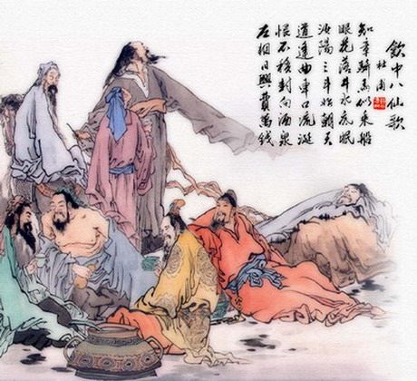 [译文] 天子在湖池游宴,召他为诗作序,他因酒醉不肯上船,自称是酒中之仙。 【作品名称】饮中八仙歌 饮中八仙歌 杜甫 知章骑马似乘船,眼花落井水底眠。 汝阳三斗始朝天,道逢曲车口流涎, 恨不移封向酒泉。左相日兴费万钱, 饮如长鲸吸百川,衔杯乐圣称避贤。 宗之潇洒美少年,举觞白眼望青天, 皎如玉树临风前。苏晋长斋绣佛前, 醉中往往爱逃禅。李白一斗诗百篇, 长安市上酒家眠,天子呼来不上船, 自称臣是酒中仙。张旭三杯草圣传, 脱帽露顶王公前,挥毫落纸如云烟。 焦遂五斗方卓然,高谈雄辩惊四筵。 ![]() 注释: 知章:即贺知章,越州永兴(今浙江萧山)人,官至秘书监。性旷放纵诞,自号“四明狂客”,又称“秘书外监”。他在长安一见李白,便称他为“谪仙人”,解所佩金龟换酒痛饮。这两句写贺知章醉后骑马,摇摇晃晃,像乘船一样。醉眼昏花,跌落井中犹不自知,索性醉眠井底。这是夸张地形容其醉态。 汝阳:汝阳王李琎,唐玄宗的侄子。 朝天:朝见天子。此谓李痛饮后才入朝。 麴车:酒车。 移封:改换封地。 酒泉:郡名,在今甘肃酒泉县。传说郡城下有泉,味如酒。故名酒泉。 左相:指左丞相李适之,天宝元年(742)八月为左丞相,五载(746)四月,为李林甫排挤罢相。长鲸:鲸鱼。古人以为鲸鱼能吸百川之水,故用来形容李适之的酒量之大。衔杯:贪酒。圣:酒的代称。《三国志·魏志·徐邈传》:尚书郎徐邈酒醉,校事赵达来问事,邈言“中圣人”。达复告曹操,操怒,鲜于辅解释说:“平日醉客,谓酒清者为圣人,酒浊者为贤人。”李适之罢相后,尝作诗云:“避贤初罢相,乐圣且衔杯。为问门前客,今朝几个来?”此化用李之诗句,说他虽罢相,仍豪饮如常。 宗之:崔宗之,吏部尚书崔日用之子,袭父封为齐国公,官至侍御史,也是李白的朋友。 觞:大酒杯。 白眼:晋阮籍能作青白眼,青眼看朋友,白眼视俗人。 玉树临风:崔宗之风姿秀美,故以玉树为喻。 苏晋:开元间进土,曾为户部和吏部侍郎。 长斋:长期斋戒。 绣佛:画的佛像。 逃禅:这里指不守佛门戒律。佛教戒饮酒。苏晋长斋信佛,却嗜酒,故曰“逃禅”。 李白以豪饮闻名,而且文思敏捷,常以酒助诗兴。《新唐书·李白传》载:李白应诏至长安,唐玄宗在金銮殿召见地,并赐食,亲为调羹,诏为供奉翰林。有一次,玄宗在沉香亭召他写配乐的诗,而他却在长安酒肆喝得大醉。范传正《李白新墓碑》载:玄宗泛舟白莲地,召李白来写文章,而这时李白已在翰林院喝醉了,玄宗就命高力士扶他上船来见。 张旭:吴人,唐代著名书法家,善草书,时人称为“草圣”。 脱帽露顶:写张旭狂放不羁的醉态。据说张旭每当大醉,常呼叫奔走,索笔挥洒,甚至以关濡墨而书。醒后自视手迹,以为神异,不可复得。世称“张颠”。 焦遂:布农之士,事迹不详。 卓然:神采焕发的样子。 译文1: 贺知章酒后骑马,晃晃悠悠,如在乘船。他眼睛昏花坠入井中,竟在井底睡着了。汝阳王李琎饮酒三斗以后才去觐见天子。路上碰到装载酒曲的车,酒味引得口水直流,为自己没能封在水味如酒的酒泉郡而遗憾。左相李适之为每日之兴起不惜花费万钱,饮酒如长鲸吞吸百川之水。自称举杯豪饮是为了脱略政事,以便让贤。崔宗之是一个潇洒的美少年,举杯饮酒时,常常傲视青天,俊美之姿有如玉树临风。苏晋虽在佛前斋戒吃素,饮起酒来常把佛门戒律忘得干干净净。李白饮酒一斗,立可赋诗百篇。他去长安街酒肆饮酒,常常醉眠于酒家。天子在湖池游宴,召他为诗作序,他因酒醉不肯上船,自称是酒中之仙。张旭饮酒三杯,即挥毫作书,时人称为草圣。他常不拘小节,在王公贵戚面前脱帽露顶,挥笔疾书,若得神助,其书如云烟之泻于纸张。焦遂五杯酒下肚,才得精神振奋。在酒席上高谈阔论,常常语惊四座。 译文2: 贺知章酒后骑马,摇摇摆摆,如在乘船。他两眼昏花,一不小心坠入井中,竟然在井底睡着了。汝阳王李琎饮了三斗酒之后才去朝见天子,路上碰到载酒的车,那酒味竟引得他直流口水,为自己没被封在酒泉郡而深感遗憾。左相李适之为满足每天的酒兴不惜耗费万钱。他饮起酒来就像长鲸吞吸百川之水那般,还自称开怀痛饮是为了摆脱政事,以便让贤。崔宗之是一位风流倜傥的美少年,他举起酒杯时,常常傲视青天,其俊美的风姿如同玉树临风。苏晋虽在佛前斋戒,但饮酒时常把佛门清规忘得一干二净。李白饮酒十斗,马上便可赋诗百篇。他去长安酒肆饮酒,常常在酒家醉眠。天子在湖中游玩,召他赋诗助兴,他因酒醉不肯上船,自称是“酒中仙”。张旭饮酒三杯,即挥毫作书,时人称为“草圣”。他不拘小节,常在王公贵戚面前脱帽露顶,挥笔疾书如有神助,其书作如同云烟泻于纸上。焦遂喝了五斗酒之后,方才精神焕发。他在酒筵之上高谈阔论,常常语出惊人。 赏析: 这首诗大约是746年(天宝五年)杜甫初到长安时所作,史称李白与贺知章、李适之、李琎、崔宗之、苏晋、张旭、焦遂八人俱善饮,称为“酒中八仙人”。他们虽都在长安呆过,但并不是同时都在长安,杜甫从“饮酒”这个角度把他们联系在一起,全是追叙。这首诗在体裁上也是一个创格。句句押韵,一韵到底;前不用起,后不用收;并列地分写八人,句数多少不齐,但首、尾、中腰,各用两句,前后或三或四,变化中仍有条理。八人中,贺知章资格最老(比李白大41岁),所以放在第一位。其他按官爵,从王公宰相一直说到布衣。写八人醉态各有特点