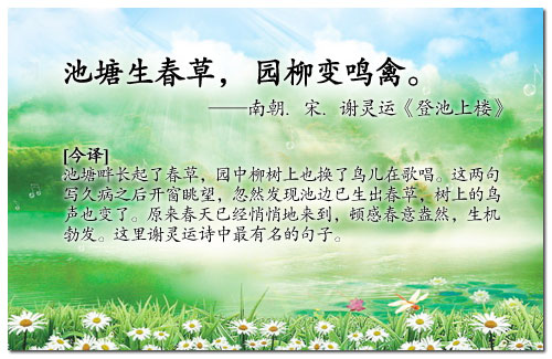 [译文] 池塘边逐渐萌生了青草,柳林里也增添了婉转啼鸣的小鸟。 [出自] 南朝 宋 谢灵运 《登池上楼》 潜虬媚幽姿,飞鸿响远音。 薄霄愧云浮,栖川怍渊沉。 进德智所拙,退耕力不任。 徇禄反穷海,卧疴对空林。 衾枕昧节候,褰开暂窥临。 倾耳聆波澜,举目眺岖嵚。 初景革绪风,新阳改故阴。 池塘生春草,园柳变鸣禽。 祁祁伤豳歌,萋萋感楚吟。 索居易永久,离群难处心。 持操岂独古,无闷征在今。 ![]() 注释: 虬:传说中一种有角的小龙。 媚:自我欣赏。 幽姿:优美的姿态。 薄:迫近。怍:惭愧。 进德:增进自己的德业,此指仕途上的进取。 退耕:隐退耕作。 徇禄:追求官爵俸禄。 穷海:边元的海滨,此指永嘉(今浙江温州)。 疴(ē):病。卧疴,卧病在床。 衾:被子。 昧:不明白。这句说因卧病而竟不知季节的变换。 褰开:揭开帷幔。 窥临:近窗观望。 聆: 听。 岖嵚(qīn):山势高峻的样子。 初景:初春的阳光。 革:改变。 绪风:冬季残留下来的寒风。 新阳:新春。故阴:已过去的冬季。变鸣禽:鸣叫的鸟儿变换着种类。 祁祁:众多的样子。 豳歌:指 《诗经·豳风·七月》,其中有“春日迟迟,采蘩祁祁,女心伤悲,殆及公子同归”的诗句。 萋萋:草的样子。 楚吟:指《楚辞·招隐士》,其中有“王孙游兮不归,春草生兮萋萋” 的句子。 索居:独居。 易永久:容易感到时间长久。离群:离开朋友。处心:安心。 持操:保持自己高尚的节操。 岂独古:难道只有古人能做到。无闷:没有。 指隐士不为世俗易其志,不求成名, 避世而无所烦闷。 出自《易经·乾卦》。征:验,得到证实。 译文: 沉潜的龙,姿态是多么的幽闲多么的美妙啊!高飞的鸿鸟,声音是多么的响亮多么的传远啊!我想要停留在天空(仕进功名),却愧对天上的飞鸿;我想要栖息川谷(隐退沉潜),却惭对深渊的潜龙。我仕进修德,却智慧拙劣;我退隐耕田,却又力量无法胜任。为了追求俸禄,我来到这偏远的海边做官,兼又卧病在床,面对著光秃秃的树林。(每天)蒙著被子,睡著枕头,浑不知季节气候的变化。偶然间揭开窗帷,暂且登楼眺望。倾耳细听有那流水波动的声音,举目眺望有那巍峨高峻的山岭。初春的阳光已经代替了残余的冬风,新来的阳气也更替了去冬的阴冷。(不知不觉)池塘已经长满了春草,园中柳条上的鸣禽也变了种类、换了声音。想起《采繁祁祁》这首豳诗,真使我伤悲,想到《春草生兮萋萋》这首楚歌,更是让我感慨。唉!独居的生活真容易让人觉得时间难捱、特别长久,而离开群体的处境也真是让人难以安心。坚持节操那里仅仅是古人才做得到呢?所谓的“遯世无闷”今天在我的身上已经徵验、实践了。 赏析: 全诗可分为三个层次。第一层写他出任永嘉大守的矛盾心情,懊悔自己既不能像潜藏的虬那样安然退隐,又不可能像高飞的鸿那样声震四方,建功立业。第二层写他在病中临窗远眺。第三层写他的思归之情。 前八句为第一层,主要写官场失意后的不满与当时矛盾的处境。魏晋南朝时代权力斗争激烈,仕途风波险恶,因此士族文人既有进取之志,又有企羡隐逸之心,而诗人所面临的,却是两者俱无所得的困境。诗一开头即由此下笔:“潜虬”一句喻深藏不露、孤高自赏的生活,“飞鸿”一句喻奋进高飞、声名动世的境界;下面两句说无论前者还是后者,自己都不能做到,深感惭傀。四句中,第三句紧接第二句,第四句远承第一句,诗意连贯而有变化。以上四句用形象的比喻写出自己的困境,但为何会这样,并未交代清楚,所以又有后四句把前四句加以落实。“进德”谓进取功业,施恩德于世人,与“飞鸿”一句相应。——但虽有此志,却是才智不及。这句实际的意思,是说自己耿直守正,乃至受人陷害。“退耕”谓退隐田园,以耕作自资,与“潜虬”一句相应。——但徒怀此愿,却是力所未能。以谢氏的富有,当然谈不上“退耕力不任”的问题。这句实际的意思,是说自己颇有退隐之心,只是为形势所格,无法实现。因为当时谢灵运如果拒绝赴任,就是公开表示与当权者对抗,极可能招致更大麻烦。下面进一步写自己于无奈中来到这偏僻的海隅,入冬后久卧病床,所对唯有萧索枯瑟之空林。全诗由虚入实,由远及近,气氛渐渐降到最低点。 自“衾枕”以下八句为第二层,写登楼所见满目春色。“衾枕昧节候”紧承前一句”卧疴对空林”而来,写卧病中不知不觉,已是冬去春来,同时自然而然引出下旬“褰开暂登临”。“暂”谓短时间,有抱病强起之意。“倾耳”、“举目”两句,写出诗人对自然风光的极度喜爱。池塘水波轻拍,在倾耳细听之际,令人虑澄意解;远山参差耸立,于放眼遥望之中,使人心旷神怡。眼前是一派景色:“初景”即新春的阳光,正在革除“绪风”即残冬的余风,“新阳”即春代替了“故阴”即冬的统治。“初景”、“新阳”写出总体的感受,是虚笔,下面“池塘”、“园柳”两句,转为近景的具体描绘。“池塘生春草,园柳变鸣禽”,是谢诗中最著名的诗句之一,曾引起很多人的赞赏,甚至引出一些带有神秘性的传说。钟蝾《诗品》引《谢氏家录》说:“康乐(谢灵运袭爵康乐公)每对惠连(谢惠连,灵运之从弟),辄得佳语。后在永嘉西堂,思诗竟日不就,寤寐间忽见惠连,即成‘池塘生春草’。故尝云:‘此语有神助,非我语也’。”故事的真实性如何暂且不论,这一联诗的名声,看来确是不小。但也有人提出:这二句实在很平常,没有什么可