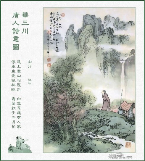 远上寒山石径斜, 【注释】 1.山行:在山中行走。 2.寒山:指深秋时候的山。 3.径:小路。 4.白云生处:白云缭绕而生的地方。 5.坐:因为;由于。