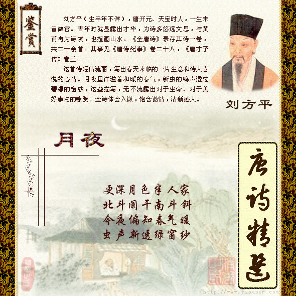 刘方平(生卒年不详),河南洛阳人。天宝前期曾应进士试,未考取,从此隐居颍水、汝河之滨,终生未仕。与皇甫冉为诗友,为薪颖士赏识。工诗,善画山水。其诗多咏物写景之作,尤擅绝句,其诗多写闺情、乡思,思想内容较贫弱,但艺术性较高,善于寓情于景,意蕴无穷。其《月夜》 、《春怨》、《新春》、《秋夜泛舟》等都是历来为人传诵的名作。 《月夜》写得自然流畅,生趣横溢,洋溢着诗人对春天、对生命的赞颂。“虫声新透绿窗纱”一句,展现诗人捕捉物象的敏锐能独特的审美视角,特别是一个“透”字,写出了“感觉”,可谓传神。这首诗写的是月夜中透露出的春意,构思新颖别致。诗人选取了静寂的散发着寒意的月夜为背景,从夜寒中显示出春天的暖意,从静寂中显示出生命的萌动,从几声虫叫引起人们对春回大地的美好联想。