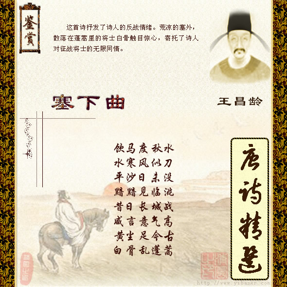 作者:王昌龄 饮马渡秋水,水寒风似刀。 平沙日未没,黯黯见临洮。 昔日长城战,咸言意气高。 黄尘足今古,白骨乱蓬蒿。 ![]() 【注解】: 1、黯黯:同“暗暗”; 2、临洮:今甘肃岷县一带,是长城起点。 3、咸:都。 【韵译】: 牵马饮水渡过了那大河,水寒刺骨秋风如剑如刀。 沙场广袤夕阳尚未下落,昏暗中看见遥远的临洮。 当年长城曾经一次鏖战,都说戍边战士的意气高。 自古以来这里黄尘迷漫,遍地白骨零乱夹着野草。 【评析】: 这首乐府曲是以长城为背景,描绘战争的悲惨残酷。诗的前四句写塞外晚秋时节,平沙日落的荒凉景象;后四句写长城一带,历来是战场,白骨成丘,景象荒凉。 全诗写得触目惊心,表达了非战思想。