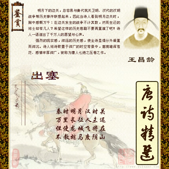 作者:王昌龄 秦时明月汉时关,万里长征人未还。 但使龙城飞将在,不教胡马渡阴山。 ![]() 【注解】: 1、但使:只要。 2、龙城:龙城是匈奴祭天集会的地方。 3、飞将:指汉朝名将李广而言,匈奴畏惧他的神勇,特称他为“飞将军”。 4、阴山:昆仑山的北支,起自河套西北,横贯绥远、察哈尔及热河北部,是我国北方的屏障。 1、但使:只要。 2、龙城:是匈奴人祭祀祖先、天地和鬼神的神圣场所。卫青第一次出塞便直捣龙城,将其付之一炬,在心理上,给敌人以沉重打击,而李广并没有到过这个龙城。王安石认为龙城指的是卢龙城,右北平唐朝时更为平州,平州治所为卢龙县。因此,龙城之指有疑。由于当时人们将李广与卫青并称,所以可能是作者受到影响,出现小误。 3、飞将:指汉朝的将军李广,曾镇守右北平,匈奴人数年不敢犯边,称之为汉之飞将军。 4、阴山:昆仑山的北支,起自河套西北,横贯绥(sui)远、察哈尔及热河北部,是我国北方的屏障。 译文 秦汉时的明月,秦汉时的边关,至今依然如故,而战争却一直不曾间断,已有无数将士血洒疆场,又有多少战士仍然戍守着边关,不能归来。只要当年镇守龙城的大将军李广还在,就不会让匈奴的骑兵跨过阴山,侵犯我中原。 【韵译】: 依旧是秦时的明月汉时的边关,征战长久延续万里征夫不回还。 倘若龙城的飞将李广而今健在,绝不许匈奴南下牧马度过阴山。 【评析】: 这是一首慨叹边战不断,国无良将的边塞诗。诗的首句最耐人寻味。说的是此地汉关,明月秦时,大有历史变换,征战未断的感叹。二句写征人未还,多少儿男战死沙场,留下多少悲剧。三、四句写出千百年来人民的共同意愿,冀望有“龙城飞将”出现,平息胡乱,安定边防。全诗以平凡的语言,唱出雄浑豁达的主旨,气势流畅,一气呵成,吟之莫不叫绝。明人李攀龙曾推奖它是唐代七绝压卷之作,实不过分。 这是一首慨叹边战不断,国无良将的边塞诗。诗的首句最耐人寻味。说的是此地汉关,明月秦时,大有历史变换,征战未断的感叹。二句写征人未还,多少男儿战死沙场,留下多少悲剧。三、四句写出千百年来人民的共同意愿,冀望有“龙城飞将”出现,平息胡乱,安定边防。全诗以平凡的语言,唱出雄浑豁达的主旨,气势流畅,一气呵成,吟之莫不叫绝。明人李攀龙曾推奖它是唐代七绝压卷之作,实不过分。 塞当作求取功名的一种出路。一些大都有边塞生活经历的知识分子,他们的诗歌以描写边塞生活为主要内容,这就形成了所谓“边塞诗派”。 王昌龄是这个流派中的重要成员。 诗从写景入手。“秦时明月汉时关”,皓月当空,照耀着万里边疆的关塞,显示了边疆的寥廓和景物的萧条。在“月”和“关”的前面用“秦汉时”加以修饰,使意境更加高远,把我们引到了遥远的古代,更引人深思:秦汉以来边防战争连续不断,一直持续至今,真是拖得太久了!这是从时间上描写边塞的悠久。 面对这样的景象,边人触景生情,自然联想起秦汉以来无数献身边疆、至死未归的人们。“万里长征人未还”,又从空间角度点明边塞的遥远。这里的“人”,既是指已经战死的士卒,也指还在戍守不能回归的士卒。“人未还”,一是说明边防不巩固,二是对士卒表示同情。这本是一个问题的两个方面,前者是因,后者是果。这是从秦到汉乃至于唐代,都没有解决的大问题,怎样来解决这个问题呢?第三、四两句就是诗人的回答。 “但使龙城飞将在,不教胡马度阴山”,直接抒发了边防士卒巩固边防的愿望和保卫国家的壮志:只要有卫青那样的名将,敌人的马队就不会度过阴山。这两句写得意在言外。意思就是说:由于朝廷用人不当,使将帅不得其人,才造成了烽火长燃、征人不还的局面。 这首诗虽然只有短短四行,但是通过对边疆景物和征人心理的描绘,表现的内容是复杂的。既有对久戍士卒的浓厚同情和结束这种边防不顾局面的愿望;又流露了对朝廷不能选贤任能的不满,同时又以大局为重,认识到战争的正义性,因而个人利益服从国家安全的需要,发出了“不教胡马度阴山”的誓言,洋溢着爱国激情。 诗人并没有对边塞风光进行细致的描绘,他只是选取了征戍生活中的一个典型画面来揭示士卒的内心世界。景物描写只是用来刻画人物思想感情的一种手段,汉关秦月,无不是融情入景,浸透了人物的感情色彩。把复杂的内容熔铸在四行诗里,深沉含蓄,耐人寻味。这首诗意境雄浑,格调昂扬,语言凝炼明快。