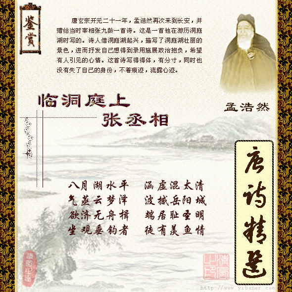作者:孟浩然 八月湖水平,涵虚混太清。 气蒸云梦泽,波撼岳阳城。 欲济无舟楫,端居耻圣明。 坐观垂钓者,徒有羡鱼情。 ![]() 【注解】: 1、张丞相:指张九龄。 2、涵虚:包含天空,指天倒映在水中。 3、混太清:与天混成一体。 4、云梦泽:古时云泽和梦泽指湖北南部,湖南北部一代低洼地区。 5、济:渡。 6、端居:安居。 【韵译】: 八月洞庭湖水盛涨浩渺无边,水天含混迷迷接连太空。 云梦二泽水气蒸腾白白茫茫,波涛汹涌似乎把岳阳城撼动。 我想渡水苦于找不到船与桨,圣明时代闲居委实羞愧难容。 闲坐观看别人辛勤临河垂钓,只能白白羡慕别人得鱼成功。 【评析】: 这是一首“干禄”诗。所谓“干禄”,即是向达官贵人呈献诗文,以求引荐录用。玄宗开元二十一年(733),张九龄为丞相,作者西游长安,以此诗献之,以求录用。诗前半泛写洞庭波澜壮阔,景色宏大,象征开元的清明政治。后半即景生情,抒发个人进身无路,闲居无聊的苦衷,表达了急于用世的决心。全诗颂对方,而不过分;乞录用,而不自贬,不亢不卑,十分得体。