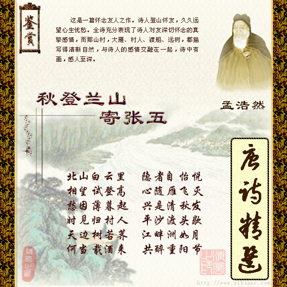 作者:孟浩然 北山白云里,隐者自怡悦。 相望始登高,心随雁飞灭。 愁因薄暮起,兴是清秋发。 时见归村人,沙行渡头歇。 天边树若荠,江畔洲如月。 何当载酒来,共醉重阳节。 ![]() 【注解】: 1、荠:野菜名,这里形容远望中天边树林的细小。 2、重阳节:旧以阴历九月九日为重阳节,有登高风俗。 【韵译】: 面对北山岭上白云起伏霏霏,我这隐者自己能把欢欣品味。 我试着登上高山是为了遥望,心情早就随着鸿雁远去高飞。 忧愁每每是薄暮引发的情绪,兴致往往是清秋招致的氛围。 在山上时时望见回村的人们,走过沙滩坐在渡口憩息歇累。 远看天边的树林活象是荠菜,俯视江畔的沙洲好比是弯月。 什么时候你能载酒到这里来,重阳佳节咱们开怀畅饮共醉。 【评析】: 这是一首临秋登高远望,怀念旧友的诗。开头四句,先点自悦,然后登山望张五;五、六两句点明秋天节气;七、八两句写登山望见山下之人;九、十两句,写远望所见;最后两句写自己的希望。 全诗情随景生,以景烘情,情景交融,浑为一体。“情飘逸而真挚,景情淡而优美。”诗人怀故友而登高,望飞雁而孤寂,临薄暮而惆怅,处清秋而发兴,自然希望挚友到来一起共度佳节。“愁因薄暮起,兴是清秋发”,“天边树若荠,江畔洲如月”,细细品尝,够人玩味。