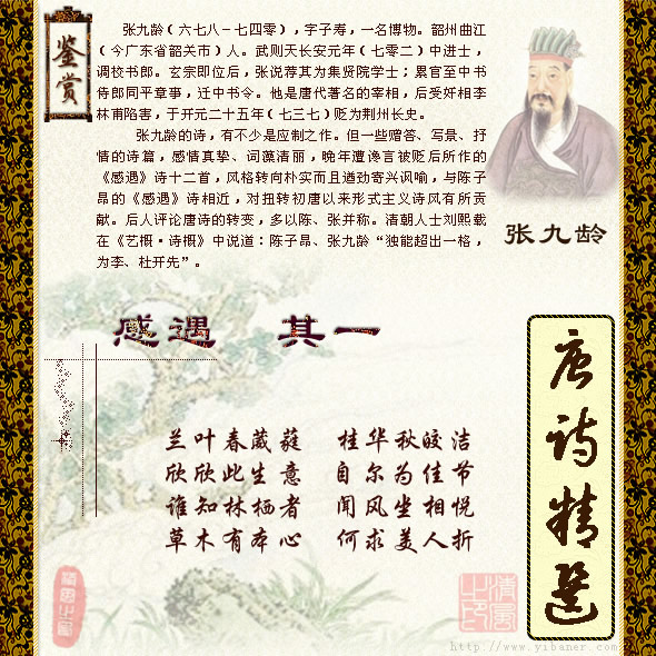 作者:张九龄 兰叶春葳蕤,桂华秋皎洁。 欣欣此生意,自尔为佳节。 谁知林栖者,闻风坐相悦。 草木有本心,何求美人折? ![]() 【注解】: 1、葳蕤:枝叶茂盛而纷披。 2、坐:因而。 3、本心:天性。 【韵译】: 泽兰逢春茂盛芳馨,桂花遇秋皎洁清新。 兰桂欣欣生机勃发,春秋自成佳节良辰。 谁能领悟山中隐士,闻香深生仰慕之情? 花卉流香原为天性,何求美人采撷扬名。 【评析】: 此诗系张九龄遭谗贬谪后所作《感遇》十二首之冠首。诗借物起兴,自比兰桂,抒发诗人孤芳自赏,气节清高,不求引用之情感。 诗一开始用整齐的偶句,以春兰秋桂对举,点出无限生机和清雅高洁之特征。三、四句,写兰桂充满活力却荣而不媚,不求人知之品质。上半首写兰桂,不写人。五、六句以“谁知”急转引出与兰桂同调的山中隐者来。末两句点出无心与物相竞的情怀。 全诗一面表达了恬淡从容超脱的襟怀,另一面忧谗惧祸的心情也隐然可见。诗以草木照应,旨诣深刻,于咏物背后,寄寓着生活哲理。