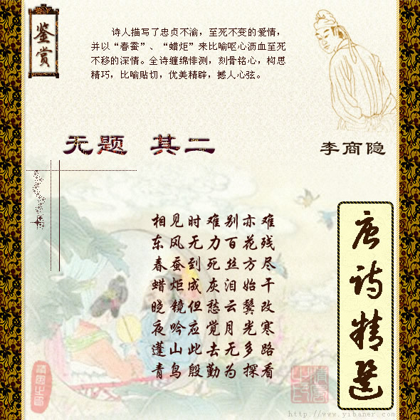 作者:李商隐 相见时难别亦难,东风无力百花残。 春蚕到死丝方尽,腊炬成灰泪始干。 晓镜但愁云鬓改,夜吟应觉月光寒。 蓬莱此去无多路,青鸟殷勤为探看。 ![]() 【注解】: 1、东风句:指相别时为幕春时节。 2、丝:与“思”谐音。 3、应觉:也是设想之词。 4、月光寒:指夜渐深。 5、蓬莱:蓬莱山,指仙境。 【韵译】: 聚首多么不易,离别更是难舍难分; 暮春作别,恰似东风力尽百花凋残。 春蚕至死,它才把所有的丝儿吐尽; 红烛自焚殆尽,满腔热泪方才涸干。 清晨对镜晓妆,唯恐如云双鬓改色; 夜阑对月自吟,该会觉得太过凄惨。 蓬莱仙境距离这里,没有多少路程,殷勤的青鸟信使,多劳您为我探看。 【评析】: 就诗而论,这是一首表示两情至死不渝的爱情诗。然而历来颇多认为或许有人事关系上的隐托。起句两个“难”字,点出了聚首不易,别离更难之情,感情绵邈,语言多姿,落笔非凡。颔联以春蚕绛腊作比,十分精彩,既缠缅沉痛,又坚贞不渝。接着颈联写晓妆对镜,抚鬓自伤,是自计;良夜苦吟,月光披寒,是计人。相劝自我珍重,善加护惜,却又苦情密意,体贴入微,可谓千回百转,神情燕婉。最终末联写希望信使频传佳音,意致婉曲,柳暗花明,真是终境逢生,别有洞天。春蚕两句,千秋佳绝。