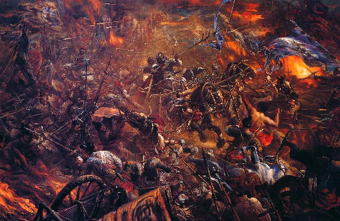 唐·李贺 黑云压城城欲摧,甲光向日金鳞开。 角声满天秋色里,塞上燕脂凝夜紫。 半卷红旗临易水,霜重鼓寒声不起。 报君黄金台上意,提携玉龙为君死。 [注释] (1)雁门太守行:(古乐府曲调名)雁门,郡名,位于山西代县。 (2)摧:毁坏。这句形容敌军兵临城下的紧张气氛和临危形势。 (3)向日:迎着太阳。亦有版本写作“向月”。 (4)甲光:铠甲迎着太阳闪出的光。甲,指铠甲,战衣。 (5)向:向着,对着。 (6)开:打开,铺开。 (7)金鳞开:(铠甲)像金色的鱼鳞一样闪闪发光。金:像金子一样的颜色和光泽。 (8)角:古代军中一种吹奏乐器,多用兽角制成,也是古代军中的号角。 (9)塞土燕脂凝夜紫:长城附近多紫色泥土。燕脂,即胭脂,深红色。这里写夕晖掩映下,塞土有如燕脂凝成,紫色更显得浓艳 (10)塞土:亦有版本写作“塞上”。 (11)燕脂:调脂饰女面,产于燕地,故曰燕脂,一种红色化妆品。这里指暮色中塞上泥土有如胭脂凝成。据说长城附近多半是紫色泥土。一作“胭脂”。 (12)临:逼近,到,临近。 (13)易水:河名,大清河上源支流,源出今河北省易县,向东南流入大清河。战国时荆轲前往刺秦王,燕太子丹及众人送至易水边,荆轲慷慨而歌:“风萧萧兮易水寒,壮士一去兮不复还!” (14)霜重鼓寒:天寒霜降,战鼓声沉闷而不响亮。 (15)声不起:形容鼓声低沉;不高扬。 (16)报:报答。 (17)黄金台:故址在今河北省易县东南,相传战国燕昭王所筑,置千金于台上,以招聘人才、招揽隐士。 (18)意:信任,重用。 (19)玉龙:宝剑的代称。 (20)君:君王。 翻译: (一): 战争的乌云翻滚而来,像是要把城楼压垮; 鳞片状的铠甲在日光照射下金光闪闪。 号角的声音在这秋色里响彻天空; 夜色中塞上泥土犹如胭脂凝成,浓艳得近似紫色。 寒风卷动着红旗,部队抵达易水; 凝重的霜湿透了鼓皮,鼓声低沉,扬不起来。 为了报答国君的赏赐和厚爱, 手执宝剑甘愿为国血战到死! (二): 战争的乌云翻滚而来,像是要把城楼压垮,将士的铁甲在阳光下闪耀,我自岿然不动。号角声声,响彻秋夜的长空,塞上战士的鲜血和泥土凝成紫色,战斗惨烈。援军连夜到达易水,半卷红旗,冒着霜寒,战鼓低沉,一场新的斗争即将开始。为报答君王在黄金台招贤纳士的恩惠,将士拿起玉龙宝剑愿为君王决一死战。 ![]() 赏析: 《雁门太守行》原为乐府诗题,中唐诗人李贺用它创作了一首描写战争场面的诗歌。这首诗,用浓艳斑驳的色彩描绘悲壮惨烈的战斗场面,奇异的画面准确地表现了特定时间、特定地点的边塞风光和瞬息万变的战争风云。 《雁门太守行》是乐府旧题,唐人的这类拟古诗,是相对唐代“近体诗”而言的。它有较宽押韵,押韵,不受太多格律束缚,可以说是古人的一种半自由诗。后称“乐府诗”。多介绍战争场景。 诗人的语言极力避免平淡而追求峭奇。为了追求奇,他在事物的色彩和情态上着力,用浓辞丽藻大红大绿去表现紧张悲壮的战斗场面,构思新奇,形象丰富。 一般说来,写悲壮惨烈的战斗场面不宜使用表现浓艳色彩的词语,而李贺这首诗几乎句句都有鲜明的色彩,其中如金色、胭脂色和紫红色,非但鲜明,而且浓艳,它们和黑色、秋色、玉白色等等交织在一起,构成色彩斑斓的画面。诗人就象一个高明的画家,特别善于着色,以色示物,以色感人,不只勾勒轮廓而已。他写诗,绝少运用白描手法,总是借助想象给事物涂上各种各样新奇浓重的色彩,有效地显示了它们的多层次性。 诗共八句,前四句写日落前的情景。首句既是写景,也是写事,成功地渲染了敌军兵临城下的紧张气氛和危急形势。“黑云压城城欲摧”一个“压”字,把敌军人马众多,来势凶猛,以及交战双方力量悬殊、守军将士处境艰难等等,淋漓尽致地揭示出来。次句写城内的守军,以与城外的敌军相对比,忽然,风云变幻,一缕日光从云缝里透射下来,映照在守城将士的甲衣上,只见金光闪闪,耀人眼目。此刻他们正披坚执锐,严阵以待。这里借日光来显示守军的阵营和士气,情景相生,奇妙无比。据说王安石曾批评这句说:“方黑云压城,岂有向日之甲光?”杨慎声称自己确乎见到此类景象,指责王安石说:“宋老头巾不知诗。”(《升庵诗话》)其实艺术的真实和生活的真实不能等同起来,敌军围城,未必有黑云出现;守军列阵,也未必就有日光前来映照助威,诗中的黑云和日光,是诗人用来造境造意的手段。三、四句分别从听觉和视觉两方面铺写阴寒惨切的战地气氛。时值深秋,万木摇落,在一片死寂之中,那角声呜呜咽咽地鸣响起来。显然,一场惊心动魄的战斗正在进行。“角声满天”,勾画出战争的规模。敌军依仗人多势众,鼓噪而前,步步紧逼。守军并不因势孤力弱而怯阵,在号角声的鼓舞下,他们士气高昂,奋力反击。战斗从白昼持续到黄昏。诗人没有直接写车毂交错、短兵相接的激烈场面,只对双方收兵后战场上的景象作了粗略的然而极富表现力的点染:鏖战从白天进行到夜晚,晚霞映照着战场,那大块大块的胭脂般鲜红的血迹,透过夜雾凝结在大地上呈现出一片紫色。这种黯然凝重的氛围,衬托出战地的悲壮场面,暗示攻守双方都有大量伤亡,守城将士依然处于不利的地位,为下面写友军的援救作了必要的铺垫。 后四句写唐军将士夜袭敌营,以死报效朝廷。“半卷红旗临易水”,“半卷”二字含义极为丰富。黑夜行军,偃旗息鼓,为的是“出其不意,攻其不备”;“临易水”既表明交战的地点,又暗