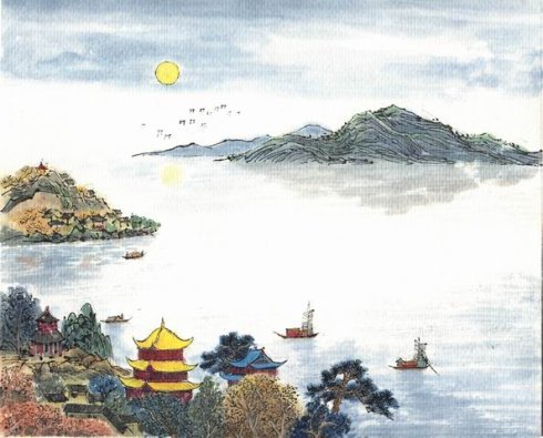 “湖光秋月两相和,潭面无风镜未磨”的意思:洞庭湖上月光和水色交相融和,湖面风平浪静如同未磨拭的铜镜。 出自刘禹锡《望洞庭》 湖光秋月两相和,潭面无风镜未磨。 遥望洞庭山水翠,白银盘里一青螺。 注释 洞庭:湖名,在今湖南省北部。 湖光:湖面的波光。两:指湖光和秋月。和:和谐。指水色与月光互相辉映。 潭面:指湖面。镜未磨:古人的镜子用铜制作、磨成。这里一说是湖面无风,水平如镜;一说是远望湖中的景物,隐约不清,如同镜面没打磨时照物模糊。 山水翠:也作“山水色”。山:指洞庭湖中的君山。 白银盘:形容平静而又清的洞庭湖面。白银:一作“白云”。青螺:这里用来形容洞庭湖中的君山。[1] [3] [4] 译文 洞庭湖上月光和水色交相融和,湖面风平浪静如同未磨拭的铜镜。 远远眺望洞庭湖山水苍翠如墨,好似洁白银盘里托着青青的螺。 ![]() [赏析] 这是诗人遥望洞庭湖而写的风景诗,明白如话而意味隽永。日暮时分,天还没黑但月亮已经出来,如明镜般平静的湖面开阔廖远。因为太阳已落,湖水不反光,像镜子没磨时光泽暗淡的样子。古代没有玻璃,镜子是用青铜铸的,磨光以后才能照人。未磨的镜面,平而不滑,明而不亮,朦朦胧胧,用来形容月夜湖光,真是恰到好处。诗人又将视线移向远方:洞庭湖心,青山一点,那就是自古闻名的君山了。湖中翠绿的君山好比搁在白银盘子里的青螺。全诗纯然写景,既有描写的细致,又有比喻的生动,读来饶有趣味。 ![]() 赏析二: 此诗通过对洞庭湖高旷清超的描写,充分表现出诗人的奇思异采。表达了诗人对洞庭湖的喜爱和赞美之情。 诗中描写了秋夜月光下洞庭湖的优美景色。微波不兴,平静秀美,分外怡人。诗人飞驰想像,以清新的笔调,生动地描绘出洞庭湖水宁静、祥和的朦胧美,勾画出一幅美丽的洞庭山水图。表现了诗人对大自然的热爱,也表现了诗人壮阔不凡的气度和高卓清奇的情致。 诗从一个“望”字着眼,“水月交融”、“湖平如镜”,是近望所见;“洞庭山水”、“犹如青螺”,是遥望所得。虽都是写望中景象,差异却显而易见。近景美妙、别致;远景迷潆、奇丽。潭面如镜,湖水如盘,君山如螺。银盘与青螺相映,明月与湖光互衬,更觉情景相容、相得益彰。诗人笔下的君山犹如镶嵌在明镜洞庭湖上一颗精美绝伦的翡翠,令人美不胜收。其用词也极精到。 首句描写澄彻空明的湖水与素月青光交相辉映,俨如琼田玉鉴,是一派空灵、缥缈、宁静、和谐的境界。表现出天水一色,玉字无尘的融和画面。“和”字下得工炼,表现出了水天一色、玉宇无尘的融和的画境。而且,似乎还把一种水国之夜的节奏——演漾的月光与湖水吞吐的韵律,传达给读者了。 第二句描绘湖上无风,迷迷蒙蒙的湖面宛如未经磨拭的铜镜。“镜未磨”三字十分形象贴切地表现了千里洞庭风平浪静、安宁温柔的景象,在月光下别具一种朦胧美。因为只有“潭面无风”,波澜不惊,湖光和秋月才能两相协调。否则,湖面狂风怒号,浊浪排空,湖光和秋月便无法辉映成趣,也就无有“两相和”可言了。 第三、四句诗人的视线从广阔的湖光月色的整体画面集中到君山一点。在皓月银辉之下,洞庭山愈显青翠,洞庭水愈显清澈,山水浑然一体,望去如同一只雕镂透剔的银盘里,放了一颗小巧玲珑的青螺,十分惹人喜爱。诗人笔下秋月之中的洞庭山水变成了一件精美绝伦的工艺美术珍品,给人以莫大的艺术享受。“白银盘里一青螺”,真是匪夷所思的妙句。此句的擅胜之处,不止表现在设譬的精警上,还表现了诗人壮阔不凡的气度和寄托了诗人高卓清奇的情致。在诗人眼里,千里洞庭不过是妆楼奁镜、案上杯盘而已。举重若轻,自然凑泊,毫无矜气作色之态,这是十分难得的。把人与自然的关系表现得这样亲切,把湖山的景物描写得这样高旷清超,这正是诗人性格、情操和美学趣味的反映。没有荡思八极、纳须弥于芥子的气魄,没有振衣千仞、涅而不缁的襟抱,极富有浪漫色彩的奇思壮采。