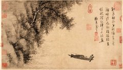 渔父① 吴镇 洞庭湖上晚风生,风触湖心一叶横。 兰棹稳,草衣轻,只钓鲈鱼不钓名。 注:①本词是吴镇临摹荆浩《渔父图》之后写下的十六首《渔父》词中的一首。 (...