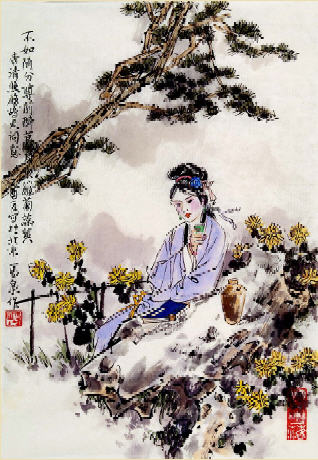 “酒阑更喜团茶苦,梦断偏宜瑞脑香”出自李清照《鹧鸪天·寒日萧萧上琐窗》 寒日萧萧上琐窗,梧桐应恨夜来霜。酒阑更喜团茶苦,梦断偏宜瑞脑香。 秋已尽,日犹长,仲宣怀远更凄凉。不如随分尊前醉,莫负东篱菊蕊黄。 【注释】 ⑴萧萧:凄清冷落的样子。原为象声词,如风声、雨声、草木摇落声、马蹄声。《诗经·小雅·车攻》有“萧萧马鸣”,《楚辞·九怀·蓄英》有“秋风兮萧萧”,《史记·刺客列传》有“风萧萧兮易水寒”。琐窗:镂刻连锁纹饰之窗户。多本作锁窗,当以琐窗为胜。 ⑵酒阑:酒尽,酒酣。阑:残,尽,晚。司马迁《史记·高祖本纪》有“酒阑”,裴骃集解曰“阑,言希也。谓饮酒者半罢半在,谓之阑。”文选·谢庄《宋孝武宣贵妃诔》有“白露凝兮岁将阑”,李善注曰“阑,犹晚也”。团茶:团片状之茶饼,饮用时则碾碎之。宋代有龙团、凤团、小龙团等多种品种,比较名贵。欧阳修《归田录》卷二:“茶之品,莫贵于龙凤,谓之团茶,凡八饼重一斤。” ⑶瑞脑:即龙涎香,一名龙脑香。 ⑷仲宣:王粲,字仲宣,汉末文学家,“建安七子”之一。其《登楼赋》抒写去国怀乡之思,驰名文坛。 ⑸随分:随便,随意。尊前:指宴席上。尊:同“樽”。 ⑹东篱菊蕊黄:化用陶渊明《饮酒二十首》的“采菊东篱下”句。 【参考译文】 深秋惨淡的阳光渐渐地照到镂刻着花纹的窗子上,梧桐树也应该怨恨夜晚来袭的寒霜。酒后更喜欢品尝团茶的浓酽苦味,梦中醒来特别适宜嗅闻瑞脑那沁人心脾的余香。 秋天快要过去了,依然觉得白昼非常漫长。比起王粲《登楼赋》所抒发的怀乡情,我觉得更加凄凉。不如学学陶渊明,沉醉酒中以摆脱忧愁,不要辜负东篱盛开的菊花。 【创作背景】 这首词写秋景,寄乡愁,应是李清照晚期作品。依词中“仲宣怀远”和“莫负东篱”两句,这首词大概作于李清照南渡后不久,时间大约是公元1128年(宋高宗建炎二年),那时赵明诚正在江宁任知府。 此词写作时间尚有争议,有人认为是李清照“晚年流寓越中所作”,当时赵明诚已去世,“茶苦”和“梦断”二语是暗寓作者的亡夫之痛。 ![]() 【赏析】 《鹧鸪天·寒日萧萧上琐窗》是宋代女词人李清照南渡后的作品。此词起笔写深秋凄凉的景色,移情于物,含悲秋伤时之意;接着写酒后喜茶,梦醒闻香,委婉含蓄,道出孤寂无聊的心境;而后引王粲怀远典故,借古寄怀,发思乡之幽情;结尾写借酒消愁,自我劝慰,凄婉情深。全词塑造了一个由多重性格所组成的抒情形象,抒发了作者故国沦丧、流离失所的悲苦之情,立意奇巧,跌宕有致。 这首词写秋景,寄乡愁,是典型的易安晚期作品。通篇从醉酒写乡愁,悲慨有致,凄婉情深。 此词开头两句写寒日梧桐,透出无限凄凉。“萧萧”这里是萧条、寂寞之意。“琐窗”是雕有连琐图案的窗棂。“上”字写出寒日渐渐升高,光线慢慢爬上窗棂,含着一个时间的过程,表明作者久久地观看着日影,见出她的百无聊赖。梧桐早凋,入秋即落叶,“恨霜”即恨霜落其叶。 草木本无知,所以,梧桐之恨,实为人之恨。从而借景抒情,绘出了作者的孤独和寂寥。因为心情不好,只好借酒排遣,饮多而醉,不禁沉睡,醒来唯觉瑞胸熏香,沁人心脾。三、四两句分别着一“喜”字“宜”字,似乎写欢乐,实际它不是写喜而是写悲。“酒阑”谓饮酒结束的时候。 “团茶”即茶饼,宋代有为进贡而特制的龙团、凤团,印有龙凤纹,最为名贵。茶能解酒;特喜苦茶,说明酒饮得特别多;酒饮得多,表明愁重。“瑞胸”,熏香名,又名龙脑,以龙脑木蒸馏而成。“宜”表面似乎是说香气宜人,实则同首句的寒日一样,是借香写环境之清寂,因为只有清冷寂静的环境中,熏香的香气才更易散发,因而变得更深更浓,更能使人明显感觉到。 上片叙事,主写饮酒之实“秋已尽,日犹长”写作者个人对秋的感受。“仲宣”句用典,以王粲思乡心情自况。王粲,字仲宣,山阳高平(今山东邹县)人,十七岁时因避战乱,南至荆州依刘表,不受重视,曾登湖北当阳县城楼,写了著名的《登楼赋》,抒发壮志未酬、怀乡思归的抑郁心情。这两句透露出词人孤身漂泊,思归不得的幽怨之情。 深秋本来使人感到凄清,加以思乡之苦,心情自然更加凄凉。“犹”、“更”这两个虚词,一写主观错觉,一写内心实感,都是加重描写乡愁。结句是为超脱语。时当深秋,篱外丛菊盛开,金色的花瓣光彩夺目,使她不禁想起晋代诗人陶潜“采菊东篱下,悠然见南山”的诗句,自我宽解起来:归家既是空想,不如对着尊中美酒,随意痛饮,莫辜负了这篱菊笑傲的秋光。“随分”犹云随便、随意。 下片写饮酒之因,是对上片醉酒的说明:本来是以酒浇愁,却又故作达观之想,而表面上的达观,实际隐含着无限乡愁。李清照的这首词是其晚年流寓越中所作,词中表露的乡愁因和故国沦丧,流离失所的悲苦结合起来,其中的忧愤更深。