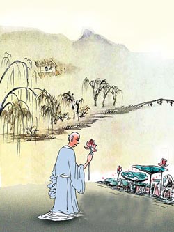 数声啼鸟怨年华。又是凄凉时候,在天涯。 [译文] 几声啼鸟鸣叫仿佛埋怨着易逝的年华,又是凄凉时节独自飘零在遥远的天涯。 [出自] 北宋 仲殊 《南柯子·忆旧》 十里青山远,潮平路带沙。数声啼鸟怨年华。又是凄凉时候,在天涯。 白露收残月,清风散晓霞。绿杨堤畔问荷花:记得年时沽酒,那人家? 注释: 仲殊:即佛印也。 怨年华: 此指鸟儿哀叹年光易逝。 凄凉时候: 指天各一方的分离时日。 白露:秋分前的节气名。时近中秋,故无暑气。 闹荷花:欣赏盛开的荷花。 年时沽酒: 去年买酒。 那人:伊人,意中人。 译文: 远处重重叠叠的青山连成一片,涨起的潮水把泥沙卷在路上。几声啼鸟鸣叫仿佛埋怨着易逝的年华,又是凄凉时节独自飘零在遥远的天涯。 白露弥漫大地,残月渐渐黯淡。阵阵晨风吹散天边的朝霞。绿杨堤畔戏问着荷花:你还记得那年买酒的那个人吗? 译文2: 十里外的青山隐约可见,潮水刚退的沙路略显潮湿,耳边传来几声鸟儿的啼叫,似在慨叹年华如水。在这秋天的凄凉时候,我依然漂泊在天涯。 白露浮现时,弯弯的月儿下去了,清晨的寒风吹散了朝霞,我一路云游中,不知不觉来到一处绿杨堤岸的荷塘旁边,我不禁忆起往事,俯身问荷花:你是否还记得那年我到此买酒喝的那个酒家? 译文3: 青山绵长有十里之远,江湖荡过带沙的小路。鸟儿时不时地叫数声,令人感到时光易逝。又到了深秋季节,我还飘泊在天涯海角。 白露时节的上弦月已经落下西山,清凉的风吹散了晚霞。我站在绿杨夹道的堤岸上,询问那亭亭玉立的荷花:还记得过年时打酒的那户人家吗? ![]() 鉴赏 仲殊,名挥,姓张。安州人,曾举进士。据说他年轻时风流倜傥,放荡不羁,因此妻子对他甚为不满,曾在食物里下了毒,他得救不死。从此,他心灰意冷,弃家为僧,居苏州承天寺、杭州吴山宝月寺。然仲殊虽出家为僧,却不甚遵守佛门清规,虽不吃肉,却嗜蜜、酒如命,每食必饮酒食蜜。这首词便是他出家为僧后所作,从这首词作中读者仍能看出一个早年放荡不羁而半路出家的和尚的自我写照。 上片着重从空间方面着笔,首二句便直接铺叙景物,展示出一幅“青山隐隐水迢迢”的画境。“十里青山远”是远望所得之景。“十里青山”本已含“远”,而这里更著一个“远”字,不仅点出“行人更在春山外”的意境,而且透露出词人不知归期的惆怅寂冷心态。“潮平带路沙”是近看所得之景。词人的视线由“十里青山”的远景观赏收回到眼前之景,由赋山转向摹水,点出行人的具体环境。第三句由写所见过渡到所闻。远处一带青山,偶尔可以听见“数声啼鸟”,这对欢乐人来说,便是青山绿水、美景如画;莺歌燕舞,良辰美景的赏心乐事,但对感触特多,凡心未尽的词人来说,却似乎觉得啼鸟在怨年光的易逝,青春易老了。这便是词人的心理情感移入到鸟啼声所引起的移情联想。由鸟的啼怨,词人不期而然地涌起又是“凄凉时候”,又是“远在天涯”的感叹了。这是词人长期的漂泊以及对这种生活的厌倦情绪的反映。 下片主要从时间方面落笔。“白露”既指秋凉的夜露,又表明了节候。“清风”句紧承前句强调白昼的结束。这两句紧承“啼鸟怨年华”的命意,形象生动地展示出时间推移的进程。“绿杨”句承前写景。杨柳堤岸,浓荫密处,微风过后,荷香飘拂,那荷花又大又丽,正撩人情思。站在荷塘边,词人突然想起来了,原来有一年,也是这个时候,他到过此地,在附近的酒家买酒喝,并乘着酒意还来观赏过荷花。他禁不住又是感叹又是喜悦,于是向着塘里的荷花问道:“荷花啊,你还记得那年买酒喝的那个醉汉么?”这一问颇含韵致,荷花在佛教徒的心目中,本是最圣洁的东西,所以释迦佛像都是坐在莲花上的。而如今词人虽为和尚,看到莲花想起的却是它那世俗的美艳,并将荷花与自己醉中赏花的事紧紧联系起来,这就表明了词人虽名为和尚的真实心态。这里词人由眼前景而追忆往昔事,仍是从时间方面来写,照应上片“又是凄凉时候、在天涯”。 全词从时空两方面构思,写景抒情,情寓于景,意象清悠,意境清晰。词作设色明艳,对比和谐,色彩艳丽,美感很强。[1] 相关高考鉴赏试题 (1)这首词的上阙在写景时用了哪些技巧?试结合诗句分析。 参考答案:①写景采用了远近结合的手法。“十里青山远”是远景,“潮平路带沙”是近景;②用了视听结合的手法。前两句诗是视觉的描写,“数声啼鸟”是听觉的描写。③运用了拟人的修辞手法。“数声啼鸟怨年华”一句其实是表达作者内心的愁怨。 (2)这首词抒发了作者哪些思想感情?你的依据分别是什么? 参考答案:①抒发了仲殊年华易逝,青春易老的忧伤之情。“数声啼鸟怨年华”一句可以看出这一点;②抒发了作者天涯飘泊的厌倦之情,“又是凄凉时候在天涯”一句可以看出;③抒发了作者故地重游既喜悦又感慨的复杂心情,“绿杨堤畔问荷花:记得年时沽酒那人家”,写的是词人站在荷塘边,突然想起来原来有一年,也是这个时候,他到过此地,在附近的酒家买酒喝,并乘着酒意还来观赏过荷花。他禁不住向着塘里的荷花问道:荷花啊,你还记得那年买酒喝的那个醉汉么?”