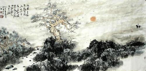 《天净沙·秋思》是元散曲作家马致远创作的小令 【出自】 元朝 马致远 《天净沙·秋思》 枯藤老树昏鸦,小桥流水人家,古道西风瘦马。 夕阳西下,断肠人在天涯。 注释: 天净沙:曲牌名。 枯藤:枯萎的枝蔓。 昏鸦:黄昏时的乌鸦。昏:傍晚。 人家:农家。此句写出了诗人对温馨的家庭的渴望。 古道:古老荒凉的道路。西风:寒冷、萧瑟的秋风。瘦马:瘦骨如柴的马。 断肠人:形容伤心悲痛到极点的人,此处指漂泊天涯、极度忧伤的旅人。 天涯:远离家乡的地方。 文1: 枯藤缠绕的老树的枝干上栖息着黄昏归巢的乌鸦,小桥下潺潺的流水映出飘荡着炊烟的几户人家。荒凉的古道上,迎着萧瑟的秋风,一位骑着瘦马的游子缓缓前行。 夕阳早已往西沉下来,漂泊未归的游子还在极远的地方。 译文2: 枯藤缠绕着老树,树枝上栖息着黄昏时归巢的乌鸦。小桥下,流水潺潺,旁边有几户人家。在古老荒凉的道路上,秋风萧瑟,一匹疲惫的瘦马驮着我前行。夕阳向西缓缓落下,极度忧伤的旅人还漂泊在天涯。 译文3: 远望黄昏时的乌鸦,正在寻觅枯藤老树栖息,近看有正依傍着小桥和流水伴居的人家,眼前只有一匹瘦马驮着漂泊的游子,在秋风古道上慢慢移步。看夕阳的余晖已经昏螟西下,羁旅在外漂泊的断肠人浪迹天涯。 ![]() 赏析: 夕阳西下使这幅昏暗的画面有了几丝惨淡的光线,更加深了悲凉的气氛。诗人把十种平淡无奇的客观景物,巧妙地连缀起来,通过枯,老,昏,古,西,瘦六个字,将诗人的无限愁思自然的寓于图景中。最后一句,断肠人在天涯是点睛之笔,这时在深秋村野图的画面上,出现了一位漂泊天涯的游子,在残阳夕照的荒凉古道上,牵着一匹瘦马,迎着凄苦的秋风,信步满游,愁肠绞断,却不知自己的归宿在何方,透露了诗人怀才不遇的悲凉情怀,恰当地表现了主题,这首小令是采取寓情于景的手法来渲染气氛,显示主题,完美地表现了漂泊天涯的旅人的愁思