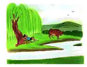 宋·杨万里 晴明风日雨干时,草满花堤水满溪。 童子柳阴眠正着,一牛吃过柳阴西。 大意 雨后的晴天,风和日丽,雨水蒸发得无影无踪。小溪的河槽涨满了流水,岸边丛生绿油油的野草,盛开着绚丽的野花。一个牧童躺在柳荫下,睡梦正甜。而那头牛只管埋头吃草,越走越远,直吃到柳林西面。 ![]() 赏析: 这首诗描写的是初春景物,刚下过一阵雨,暖日和风,溪水盈盈.河岸上,草绿花红,柳荫浓密.渲染出明媚,和暖的氛围和生机无限的意境. 这首诗前两句写出了由雨而晴,由湿而干,溪水由浅而满,花草于风中摇曳,大自然充满了春的律"动";第三句写出了牧童柳荫下酣睡的自然悠闲的"静",加上第四句"一牛吃过柳阴西"的时动时静,形成了这首诗独特的生活情趣和原始朴素的美感. 晴明风日两干时,草满花堤水满溪"一个雨后的大晴天,日头光灿灿的微风清爽爽的,地面的雨水已经蒸发得无影无踪,小溪里的水却涨满河槽.溪水滚滚,滔滔淌过碧绿的原野,奔向远处,夹岸丛生着茂密的野草,盛开着绚丽的野花. 不过,赏心悦目的江南原野的夏日风光只是诗中人物的背景."童子柳阴眠正着,一牛吃过柳阴西."小牧童和他的牛才是着幅田野小景的画面主体.堤岸旁,柳阴下一位小牧童躺在鲜花盛开的草地上正酣睡呼呼地做他的美梦,他那头老牛却只管埋头吃草,边吃边走,越吃越远,渐渐地吃到柳林西南去了. 欣赏这首小诗,你不但会醉心于江南原野自然景色的优美,还会深深领略到人和大自然之间的融洽和谐.在我们有兴味地观赏小牧童在柳阴下酣然大睡,远望他的老牛吃到柳林西南的时候,不知不觉地,仿佛自己也置身画面之中了.
