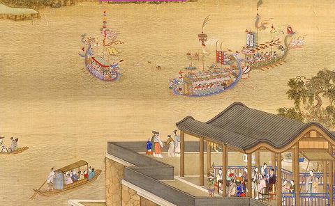 [译文] 红旗高举,在小洲柳林上空翻飞。如春雷般的鼓声震荡,龙舟从烟波浩渺的远方破浪而来,你赶我追。 [出自] 《减字木兰花》 黄裳 红旗高举,飞出深深杨柳渚。鼓击春雷,直破烟波远远回。 欢声震地,惊退万人争战气。金碧楼西,衔得锦标第一归。 注释: 红旗:发令的指挥旗。 深深:茂密的柳杨树林深处。 渚:小水洲。 鼓击春雷:击鼓声如春雷一般响彻天地。 烟波:船桨划起的水波。 金碧楼西:指领奖台。 译文: 高高地举起红旗,杨柳浓荫下箭一般飞出一艘龙舟。鼓声敲打得像春雷一样震响,龙舟冲破烟波飞到终点掉转回头。 欢呼声震天动地响彻四方,士气高昂力挫群雄赢得万众欢呼。高楼两边装点金碧辉煌的地方,壮士们已把第一名的锦标领走。 ![]() 赏析: 黄裳的这首词以龙舟竞渡为题材,颇具历史价值。龙舟竞渡,即赛龙船。相传伟大诗人屈原农历五月初五这一天投汨罗江自杀,人民为了纪念他,每逢端午节,常举行竞渡,象征抢救屈原生命,以表达对爱国诗人的尊敬和怀念。这一活动,后来成为民间的一种风俗。当地居民准备轻便快船,选拔优秀船员,到节日,在附近江河举行竞赛活动。男女老幼,官员百姓,纷纷集聚赛区观赏助兴。南朝宗懔的《荆楚岁时记》,已有关于竞渡的记载。宋耐得翁《都城纪胜》一书,专门记载南宋京城杭州的各种情况,其“舟船”条有云:“西湖春中,浙江秋中,皆有龙舟争标,轻捷可观。”龙舟竞渡时,船上有人高举红旗,还有人擂鼓,鼓舞划船人的士气,以增加竞渡的热烈气氛。这种万众欢腾的场面吸引了历代的诗词作者。黄裳很喜欢写自然景色,赛龙舟的场面也吸引了他,他的这首《竞渡》,就是描写龙舟竞渡夺标的实况。 上片写竞渡。“红旗高举,飞出深深杨柳渚”。竞赛开始了。一群红旗高举的龙舟,从柳阴深处的小洲边飞驶而出。“飞出”二字用得生动形象,令人仿佛可以看到群舟竞发的实况,赛船上迎风招展的红旗,耀眼夺目,首先映入眼帘。由于沙洲上浓密的柳荫遮蔽视线,赛船就象从柳荫中飞驶而出。“渚”,水中间的小洲。点出杨柳渚,既是以景色相衬托,也为了表明节候。作者这里用“飞出”来形容那急划而来的赛船,真实地反映了参观者的感受。 “鼓击春雷,直破烟波远远回”。竞渡时,每艘船上不仅有人高举红旗,还有鼓手击鼓以统一划船的节奏。一艘赛船里有好多名划桨手。他们之间,全靠鼓点来协同动作。所以作者说,赛船上的击鼓声,像春雷一样震响,它们冲破笼罩着江面的水气,远远地传向四面八方,在空中回荡。“直破”二字写出了船的凌厉前进的气势。这样,就渲染了竞赛的紧张气氛。 下片写夺标。竞赛,以先到达目的地的获得锦标。竞渡的高潮出现在赛船驶近锦标,胜负将见分晓的时刻:“欢声震地,惊退万人争战气”。人山人海的观众为优胜者发出了惊天动地的喝彩声。在这种震耳欲聋的助兴声中,一马当先的龙舟上的竞渡者,正在拼命地划动船桨,向终点猛冲,表现出不顾一切、勇往直前的决胜精神。健儿们争战夺标的英雄气概(争战气),简直使千万人为之惊骇退避。看来,有成千上万的观众看得惊心动魄。这里,作者只用了十一个字,就把竞渡中最壮观的场面连同它的紧张激烈的气氛和惊心动魄的声势和盘托出来了。 “金碧楼西,衔得锦标第一归”。古时的锦标,也就是一面彩缎的奖旗,一般都悬挂在终点岸边的一根竹竿上,是给予竞渡优胜者的赏物,从龙舟上就可以摘取到。在作者描绘的这场竞渡中,“金碧楼西”的岸边,就是挂锦标的位置。如金似碧(碧玉),形容这座楼阁的富丽。优胜者终于抢先到达终点,从那里“衔得锦标第一归”,胜利返航。为什么用一个“衔”字呢?“衔”,用嘴含住的意思。古时的龙舟,船头上雕有象征性的龙头装饰。看来,优胜者夺得锦标以后,就将它悬挂在船头的“龙头”上,活像一条真龙将锦标上端含在嘴里似的。“衔”是龙舟的龙形生发出来的字眼。用这个“衔”字,饶有情趣,是传神之笔。 此词采取白描手法,注意通过色彩、声音来刻画竞渡夺标的热烈紧张气氛。同时,词还反映了人们热烈紧张的精神状态。龙舟飞驶,鼓击春雷,这是写参与竞渡者的紧张行动和英雄气概。欢声震地,是写群众的热烈情绪。衔标而归,是写胜利健儿充满喜悦的形象与心情。如此以来真实地再现了当日龙舟竞渡、观者如云的情景。词写得这样生动,如果作者没有亲临现场的实感,是写不出来的;如果作者虽有实感,但在艺术上,缺乏剪裁的匠心、捕捉印象的功夫和渲染气氛的笔力,那么也是难以写得这样有声色、有层次、有气势,使人读来有身临其境之感的。