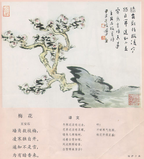 王安石 墙角数枝梅,凌寒独自开。 遥知不是雪,为有暗香来。 ![]() [注释] 1.凌寒:冒着严寒。 2.遥:远远的。 3.为:因为。 4.暗香:指梅花的幽香。 5.知:知道 [翻译] 一:墙角有几枝梅花冒着严寒独自开放。为什么远看就知道洁白的梅花不是雪呢?那是因为梅花隐隐传来阵阵的香气。 二:那墙角的几枝梅花,冒着严寒独自盛开。远望就知道洁白的梅花不是雪呢?因为梅花隐隐传来阵阵的香气。 [赏析] 这首诗通过写梅花,在严寒中怒放、洁白无瑕,赞美了梅花高贵的品德和顽强的生命力 梅花,香色俱佳,独步早春,具有不畏严寒的坚强性格和不甘落后的进取精神,因而历来为诗人们所吟咏,所歌颂。在我国古代为数众多的咏梅诗中,王安石的《梅花》堪称一首饶有特色、脍炙人口的佳作。 这首咏梅诗吟咏的是早春之梅。全诗虽仅4句20字,却较为形象地刻画了早春梅花的神韵和香色。前两句“墙角数枝梅,凌寒独自开”,写颇有寒意的早春时,万物皆未萌芽,唯独墙角数枝梅花迎寒绽开。这两句写梅花,不绘其形,而传其神。“墙角”二字点明地点;“独自开”与“数枝梅”相照应,传递了梅先天下春的信息;“凌寒”二字交代时间,突出了春梅于严寒中傲然怒放的性格特征。不过,这两句诗写梅花不畏严寒傲然怒放,并非首创。在此之前,已有别的诗加以描绘了。如南朝陈诗人谢燮的《早梅》诗:“迎春故早发,独自不疑寒。畏落众花后,无人别意看”,紧扣一个“早”字,用表现人的心理状态的“疑”与“畏”字写梅花,使之人格化,从而惟妙惟肖地反映了其傲霜斗雪迎春的高尚品格。 较之前两句,后两句“遥知不是雪,为有暗香来”写梅花的香色,则写得较为新颖别致。“遥知不是雪”,着眼于人们的视觉形象,含蓄地写梅花的纯净洁白。尽管这句诗否定了诗人于远处所看到的墙角凌寒独自绽开的数枝梅花是雪,但它实际上曲折地反映了梅白似雪的色彩。试想,假如这梅花不是白的,而是红的或是其他颜色,诗人会由此而联想到雪吗?正因为梅花似雪,唐代诗人张谓的《早梅》诗句“不知近水花先发,疑是经冬雪未消”,以错把梅枝当作雪枝来反映白梅早发、皎洁似雪的特点,才给人以“错”而无误,“错”中见奇之感。 “遥知不是雪”这句诗,不仅含蓄地写梅花的纯净洁白,也间接地交代前两句中所写的迎寒怒放的“墙角数枝梅”实为诗人从远处隐隐约约中所见,且与诉诸人们嗅觉的下句“为有暗香来”一道写梅花的香色,诗句之间具有内在联系,显示出全诗结构的严谨。 诗人写梅香,没有借助任何形容词,亦未泼墨如云,大肆渲染,而是以“看似寻常最奇崛”(王安石语)的“遥知”这两句诗巧妙自然地出之。这两句诗之间具有因果关系。正因为有梅花的香气从远处袭来,才使诗人“遥知不是雪”。倘若梅花无香气,则诗人从远处隐隐约约看到的“墙角数枝梅”,是难免把它错当作雪枝的。以互为因果的两句诗写梅花,收到了香色俱佳的艺术效果,与张谓的《早梅》诗句有异曲同工之妙。当然,“遥知”两句诗也未必是实写诗人于远处闻到梅花的香色,从而得出是梅非雪的结论,而只是虚写,极言梅花的香气之浓。 如果说,这首《梅花》诗所吟咏的梅花,不仅让人领略到其凌寒怒放的神韵,而且给人留下它香色俱佳、别具一格的鲜明印象,那么,这首诗本身也就如同它所吟咏的梅花,令人赏心悦目,获得艺术美的享受。 古人吟唱梅花的诗中,有一首相当著名,那就是在作者之前,北宋诗人林逋的《山园小梅》。尤其是诗中“疏影横斜水清浅,暗香浮动月黄昏”两句,更被赞为咏梅的绝唱。林逋这人一辈子不做官,也不娶妻生子,一个人住在西湖畔孤山山坡上种梅养鹤,过着隐居的生活。所以他的咏梅诗,表现的不过是脱离社会现实自命清高的思想。作者此诗则不同,他巧妙地借用了林逋的诗句,却能推陈出新。你看他写的梅花,洁白如雪,长在墙角但毫不自卑,远远地散发着清香。诗人通过对梅花不畏严寒的高洁品性的赞赏,用雪喻梅的冰清玉洁,又用“暗香”点出梅胜于雪,说明坚强高洁的人格所具有的伟大的魅力。作者在北宋极端复杂和艰难的局势下,积极改革,而得不到支持,其孤独心态和艰难处境,与梅花自然有共通的地方。这首小诗意味深远,而语句又十分朴素自然,没有丝毫雕琢的痕迹。