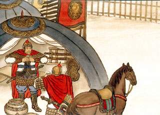 注释:这两句诗前句写自己放浪沙场然心中别有一番滋味,后句写征战现实,前句的别有滋味正是在后句。 凉州词 王翰 葡萄美酒夜光杯,欲饮琵琶马上催。 醉卧沙场君莫笑,古来征战几人回! 【诗文解释】 葡萄美酒倒满了夜光杯,正要畅饮的时候,马上的琵琶也同时在催促着。即使醉卧在沙场上你也不要笑我啊!自古征战在外的又有几人能回来呢? 【词语解释】 夜光杯:白玉制成的酒杯。 催:这里指催人出发的意思。 ① 王翰写有《凉州词》两首,慷慨悲壮,广为流传。而这首《凉州词》被明代王世贞推为唐代七绝的压卷之作。 ② 夜光杯:用白玉制成的酒杯,光可照明。它和葡萄酒都是西北地区的特产。这里指精美的酒杯。 ③沙场:平坦空旷的沙地,古时多指战场。 ④君:你。 ⑤琵琶:这里指作战时用来发出号角的声音时用的。 ⑥催:催人出征。 ⑦凉州词:“凉州歌”的唱词,是盛唐时流行的一种曲调名。 ⑧欲:将要。 ⑨征战:打仗。 【赏析】 琵琶弹奏着欢快而急促的旋律,夜光杯中盛满了西域的葡萄美酒,长年征战疆场的将士难得有这欢聚痛饮的时刻,于是举杯相邀:痛饮个一醉方休吧,「古来征战几人回」?诗人满怀激情写下这沙场之宴的劝酒词,笔端洋溢着豪放、悲壮与将士们视死如归的豪情。 浓郁的边域色彩,跳跃跌宕的结构,奔放的情绪使这首诗成为了边塞诗中的精品。 唐人七绝多是乐府歌词,凉州词即其中之一。它是按凉州(今甘肃省河西、陇右一带)地方乐调歌唱的。《新唐书·乐志》说:“天宝间乐调,皆以边地为名,若凉州、伊州、甘州之类。” 这首诗地方色彩极浓。从标题看,凉州属西北边地;从内容看,葡萄酒是当时西域特产,夜光杯是西域所进,琵琶更是西域所产。这些无一不与西北边塞风情相关。这首七绝正是一首优美的边塞诗。边塞诗,若以对战争的态度为标准。可划分为歌颂战争与暴露战争两类。本诗所写战争的性质和背景已无可考,但从诗人感情的脉搏来体会,这无疑是一首反战的诗歌。不过它不正面描写战争,却通过战前饮酒这件事来表达将士厌战的悲痛情绪,用笔十分隐蔽曲折。 首句设色艳丽,故意夸示饮宴之美:在晶莹透亮闪闪发光的杯子里斟满了葡萄美酒,战士们聚在一起准备痛饮了。写到这里,突然来一顿挫:“欲饮”而无奈“琵琶马上催”。这个上二下五的句式,妙在突然促成了文意的转折。 马上的乐队弹起琵琶催人出发,这使得将士们心情大变,由热闹舒适的欢饮环境一下被逼到紧张激昂的战前气氛中。看来无法再饮酒了!可是,“醉卧沙场君莫笑”。第三句意又一转,告诉我们:这时虽然军令如山,却是催者自催,饮者自饮,而且下决定决心要“醉卧”。 诗人似在代将士倾诉衷肠:管他呢,虽然出发在即,我们依然痛饮,不辞醉倒沙场,这种狂饮你们不会见笑吧?“君莫笑”三字,于顿挫之中一笔挑起,引出了全诗最悲痛、最决绝的一句,这就是结末的“古来征战几人回?”这个诘问句,夸张地展示了战争的残酷后果,道出了普遍性,深化了诗歌的主题。显然,这里所控诉的,已不止是将士们所面临的这一次征战,而是“古来”即有的一切由统治阶级为了自身利益而发动的驱使千千万万将士去送死的战争!全诗抒发的是反战的哀怨,所揭露的是自有战争以来生还者极少的悲惨事实,却出以豪迈旷达之笔,表现了一种视死如归的悲壮情绪,这就使人透过这种貌似豪放旷达的胸怀,更加看清了军人们心灵深处的忧伤与幻灭。《唐诗别裁集》说此诗“故作豪放之词,然悲感已极”。可谓深得作者用心。此诗的确流露了如当代论者所批判的消极情绪,但在那样的时代、那样的残酷环境中,战士和诗人们对于无休无止的边庭争战,一般也只能产生这种悲痛的情绪,我们对此就不必苛求了。 ※注释: ①夜光杯:据《海内十洲记》所载,为周穆王时西胡所献之宝。诗中用作酒杯的美称,华贵而精美的酒杯.