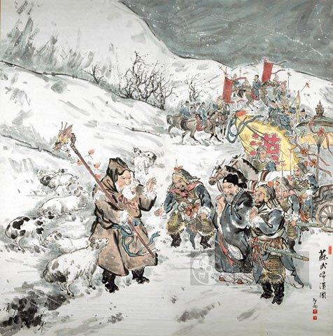 “云边雁断胡天月,陇上羊归塞草烟”这两句是追思苏武当年在北海牧羊生活的状况,反映了苏武对故国的深切思念、欲归不得的痛苦及牧羊绝塞的单调、孤寂的生活——在寂静的夜晚,空中高悬一轮带有胡地情调的明月,苏武望着大雁从北方飞来,向南方飞去,一直看到它的身影消失在南天的云彩中;在昏暗的傍晚,草原笼罩在一片荒烟中,丘陇上,苏武正步履艰难地赶着归来的羊群。诗句宛然两幅图画:前幅是望雁思归图,后幅是荒塞归牧图,情景交融,浑然一体。 出自温庭筠《苏武庙》 苏武魂销汉使前,古祠高树两茫然。 云边雁断胡天月,陇上羊归塞草烟。 回日楼台非甲帐,去时冠剑是丁年。 茂陵不见封侯印,空向秋波哭逝川! ①雁断:喻苏武与汉朝音讯断绝。 ②胡天月:带有胡地情调的月光。 ③陇上:丘陇之上。 ④苏武:是历史上著名的坚持民族气节的英雄人物。汉武帝天汉元年(公元前100年)他出使匈奴被扣留。匈奴多次逼降,他坚贞不屈。后被流放到北海(即今贝加尔湖)牧羊,直至昭帝始元六年(公元前81年),才返回汉朝,前后长达十九年。 译文 苏武初遇汉使,悲喜交集感慨万端;而今古庙高树,肃穆庄严久远渺然。 羁留北海音书断绝,头顶胡天明月;荒陇牧羊回来,茫茫草原已升暮烟。 回朝进谒楼台依旧,甲帐却无踪影;奉命出使加冠佩剑,正是潇洒壮年。 封侯受爵缅怀茂陵,君臣已不相见;空对秋水哭吊先皇,哀叹时光不还。 诗意: 当年苏武见到汉使无比激动感慨,如今面对苏武庙前的高树心绪茫茫。云边看不见飞雁的踪迹只有胡天的明月可以看得见,从陇上牧羊回来,笼照在塞上烽烟中。回到汉朝,旧日的楼台宫殿已经不是过去的样子,出使匈奴时戴冠佩剑,正是壮年。武帝已死,看不见封侯印,空向着秋水痛哭逝去的年华。 ![]() 赏析 《苏武庙》是唐代文学家温庭筠创作的一首咏史诗,是唐诗中的名篇之一。此诗是作者瞻仰苏武庙时所作,含蓄地表达了作者对苏武所怀的敬意,热情地赞扬苏武的民族气节,寄托着作者的爱国情怀。全诗借凭吊古迹而致慨,遥念先贤,启迪后进,感情极为真挚。艺术方面,其一,在有关时、空描写方面,诗篇深得纵横捭阖、驰骋自如之妙;其二,灵巧、活泼的用典,使诗歌更加情思永,耐人寻味;其三,灵巧的对仗,增加了诗歌的绘画美。 “苏武魂销汉使前,古祠高树两茫然”两句分点“苏武”与“庙”。第一句着笔就写苏武突然见到汉使,得知他已经获释可以回国时悲喜交加的激动心情。汉昭帝时,匈奴与汉和亲。汉使到匈奴后,得知苏武尚在,乃诈称汉朝皇帝射雁上林苑,得苏武系在雁足上的帛书,知武在某泽中,匈奴方才承认,并遣武回国。首句是想象苏武初次会见汉使时的情景。苏武在异域渡过漫长岁月,历尽艰辛,骤然见到来自汉朝的使者,表现出极为强烈、激动、复杂的感情。这里有辛酸的追忆,有意外的惊愕,悲喜交加,感慨无穷,种种情绪,一时奔集,难以言状,难以禁受。诗人以“魂销”二字概括,笔墨精炼,真切传神,“魂销”二字栩栩如生地描绘出苏武当时内心与外在的的的非常情态,深刻地显示出其思国若渴的爱国精神,这句是苏武生前事迹的一个特写镜头。第二句由人到庙,由古及今,描绘眼前苏武庙景物。“古祠高树”,写出苏武庙苍古肃穆,渲染出浓郁的历史气氛,写苏武庙中的建筑与古树本是无知物,它们都不知道苏武生前所历尽的千辛万苦,更不了解苏武坚贞不屈的价值,寄寓了人心不古、世态炎凉的感叹。透露出诗人崇敬追思之情。李白《蜀道难》:“蚕丛及鱼凫,开国何茫然。”茫然即渺然久远之意。古祠高树两茫然,是说祠和树都年代杳远。这就为三、四两句转入对苏武当年生活的追思缅想创造了条件。 “云边雁断胡天月,陇上羊归塞草烟”描绘的是两幅画,是用逆挽法来追忆苏武生前的苦节壮举,怀念苏武崇高的爱国精神。上一幅是望雁思归图。在寂静的夜晚,天空中高悬着一轮带有异域情调的明月。望着大雁从遥远的北方飞来,又向南方飞去,一直到它的身影逐渐消失在南天的云彩中。这幅图画,形象地表现了苏武在音讯隔绝的漫长岁月中对故国的深长思念和欲归不得的深刻痛苦,不仅叙出了苏武被流放北海时与国音讯断绝的史实,而且表现出苏武只要一息尚存就念念不忘故园,每天希望鸿雁传书于国、直盼到月上中天的爱国忠心。这句主要写苏武思国的心境。下一幅是荒塞归牧图。在昏暗的傍晚,放眼远望,只见笼罩在一片荒烟中的连天塞草,和丘陇上归来的羊群,主要写他胡地牧羊时环境的艰辛、荒凉,表现出贫贱不能移其爱国之志的胸怀。这幅图画,形象地展示了苏武牧羊绝塞的单调、孤寂生活,概括了幽禁匈奴十九年的日日夜夜,环境、经历、心情相互交触,浑然一体。颔联两句是从广阔的空间角度来写苏武留胡时内心与外在动态、环境。 “回日楼台非甲帐,去时冠剑是丁年”两句写苏武“回日”所见所感,从相隔迢遥的时间的角度上写苏武出使和归国前后的人事变换。第一句句说苏武十九年后归国时,往日的楼台殿阁虽然依旧,但武帝早已逝去,当日的“甲帐”也不复存在,流露出一种物是人非、恍如隔世的感慨,隐含着对武帝的追思。史载苏武“始以强壮出,及还,须发尽白”。李陵《答苏武书》中也有“丁年(壮年)奉使,皓首而归”之句。第二句说回想当年戴冠佩剑,奉命出使的时候,苏武还正当壮盛之年。“甲帐”、