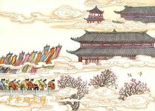 “西望瑶池降王母,东来紫气满函关。”这两句说的是诗人思念长安宫阙,心往长安,亦不忘其志向和抱负——长安宫阙巍峨,如西望可及之瑶池;紫气东来,思长安气象之恢宏。委婉含蓄,意在言外,措词别致。 出自杜甫《秋兴八首》之五 蓬莱宫阙对南山,承露金茎霄汉间。 西望瑶池降王母,东来紫气满函关。 云移雉尾开宫扇,日绕龙鳞识圣颜。 一卧沧江惊岁晚,几回青琐点朝班。 注释 蓬莱宫阙:指大明宫。蓬莱,汉宫名。唐高宗龙朔二年(662),重修大明宫,改名蓬莱宫。南山:即终南山。 承露金茎:指仙人承露盘下的铜柱。汉武帝在建章宫之西神明台上建仙人承露盘。唐代无承露盘,此乃以汉喻唐。霄汉间:高入云霄,形容承露金茎极高。 瑶池:神化传说中女神西王母的住地,在昆仑山。降王母:《穆天子传》等书记载有周穆王登昆仑山会西王母的传说。《汉武内传》则说西王母曾于某年七月七日飞降汉宫。 东来紫气:用老子自洛阳入函谷关事。《列仙传》记载,老子西游至函谷关,关尹喜登楼而望,见东极有紫气西迈,知有圣人过函谷关,后来果然见老子乘青牛车经过。函关:即函谷关。此二句借用典故极写都城长安城宫殿的宏伟气象。 云移:指宫扇云彩般地分开。雉尾:指雉尾扇,用雉尾编成,是帝王仪仗的一种。唐玄宗开元年间,萧嵩上疏建议,皇帝每月朔、望日受朝于宣政殿,上座前,用羽扇障合,俯仰升降,不令众人看见,等到坐定之后,方令人撤去羽扇。后来定为朝仪。 日绕龙鳞:形容皇帝衮袍上所绣的龙纹光彩夺目,如日光缭绕。圣颜:天子的容貌。这二句意谓宫扇云彩般地分开,在威严的朝见仪式中,自己曾亲见过皇帝的容颜。 一:一自,自从。卧沧江:指卧病夔州。岁晚:岁末,切诗题之“秋”字,兼伤年华老大。 几回:言立朝时间之短,只不过几回而已。青琐:汉未央宫门名,门饰以青色,镂以连环花纹。后亦借指宫门。点朝班:指上朝时,殿上依班次点名传呼百官朝见天子。此二句慨叹自己晚年远离朝廷,卧病夔州,虚有朝官(检校工部员外郎)之名,却久未参加朝列。 参考译文 日复一日,大明宫遥望着终南山,却望不到。那些深居的隐士,天露和玉屑,都已被他们吸光饮尽,青鸟报信,西王母自瑶池驾临,紫气弥漫,老子骑牛西去。记得当年朝上,雉尾扇开合如同祥云移回,日光沐浴着圣殿,让我看清玄宗的容貌。记得当年位列朝班,青琐门下意气风发,而现在,疾病无情地消磨着时光……秋已渐深。 ![]() 赏析 《秋兴八首》这组诗,融铸了夔州萧条的秋色,清凄的秋声,暮年多病的苦况,关心国家命运的深情,悲壮苍凉,意境深闳。它是八首蝉联、结构严密、抒情深挚的一组七言律诗,体现了诗人晚年的思想感情和艺术成就。描绘长安宫殿的巍峨壮丽,早朝场面的庄严肃穆,以及自己曾得“识圣颜”至今引为欣慰的回忆。 诗写长安宫阙之盛,回忆帝居的巍峨壮丽,早朝的肃穆庄严,回忆自己曾在中央政权中任右拾遗职“识圣颜”的辉煌经历。极写玄宗在位的太平景象,气象万千,豪情万丈,以衬托现在的国危民困、穷途落拓、暮年飘泊的忧伤和抑郁。前四句写殿前景物。后四句追溯当年上朝之事。 仙境般的宫阙遥遥对着终南山托承露盘的金人铜柱高入云霄;贵妃娘娘华清沐浴,俨然王母降临瑶池。玄宗信奉道教,传言老聃西游,函关一带一派祥和的紫气东来。前四句用赋的铺陈手法展现盛唐时代宫殿嵬峨,祥和气象。 颈联进一步追索开元盛世,一派升平。回顾诗人当年早朝,面见玄宗的盛况。皇帝每月朔望,受朝于宣政殿,上座前,羽扇障合,俯仰升降,不令众人见得,待坐定后始开扇,定为朝仪。“云移”二字言开扇时光彩闪耀,像彩云在移动。宫扇一开,圣颜显出,有如太阳升起。皇帝身着衮袍,绣着龙纹,金光灿烂,表现早朝的庄严和诗人当年何等的踌躇满志。 末二句陡然跌落,截住对开天盛事回忆,回到眼前所在。一个“惊”字写出了岁月磋跎、世事变幻,一卧沧江之后的今日,正是代宗大历元年的深秋。“几回”句,括过玄肃两朝,铭刻永不忘怀的记忆。“青锁”建章宫宫门名,诗人在肃宗时为左拾遗,在建章宫上朝。 全诗用过去的辉煌与欢乐来衬托现时的惨淡和凄凉,言有尽而意无穷。