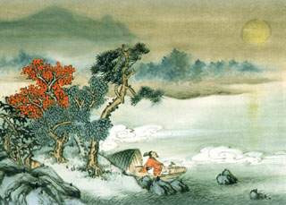 “移舟泊烟渚,日暮客愁新。”这两句是说,移舟近岸,泊船夜宿,船停在烟雾朦胧的小洲边;这时,夕阳西下,天色已晚,众鸟归林,牛羊下山,诗人触景伤情,更加激起一股在旅途中的寂苦与乡愁。“客愁”而说“新”,自然还有旧愁。逐日奔波,旧愁未尽,泊舟荒渚,新愁又生,有茫茫身世的无限感慨。 出自孟浩然《宿建德江》 移舟泊烟渚,日暮客愁新。 野旷天低树,江清月近人。 ①移舟:移船靠岸。 ②泊:停船。 ③烟渚:渚,水中的小块陆地。烟渚,烟雾朦胧中的小洲。 ⑷野:原野。旷:空阔远大。天低树:天幕低垂,好像和树木相连。 ⑸月近人:倒映在水中的月亮好像来靠近人。 ![]() 译文 小船停靠在烟雾朦胧的小舟,暮色使游子又多了一分惆怅。 原野空旷看起来天比树还低,清澈的江水将月亮送到身旁。 赏析 《宿建德江》是唐代诗人孟浩然的代表作之一。这是一首刻画秋江暮色的诗,是唐人五绝中的写景名篇。作者把小船停靠在烟雾迷蒙的江边想起了以往的事情,因而以舟泊暮宿作为自己的抒发感情的归宿,写出了作者羁旅之思。第一句点题,也为下面写景抒情作了准备;第二句中“日暮”是“客愁新”的原因;最后两句,因为“野旷”所以天低于树,因为“江清”所以月能近人,天和树、人和月的关系,写得恰切逼真。此诗前两句为触景生情,后两句为借景抒情,描写了清新的秋夜,突出表现了细微的景物特点。全诗淡而有味,含而不露,自然流出,风韵天成,颇有特色。 ![]() 此诗先写羁旅夜泊,再叙日暮添愁;然后写到宇宙广袤宁静,明月伴人更亲。一隐一现,虚实相间,两相映衬,互为补充,构成一个特殊的意境。诗中虽只有一个愁字,却把诗人内心的忧愁写得淋漓尽致,然野旷江清,秋色历历在目。