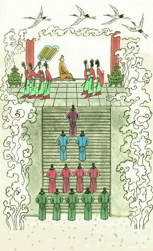 “鸡鸣紫陌曙光寒,莺啭皇州春色阑。”这两句是说,曙光初露,天气犹寒,在上朝的路上,听见鸡鸣报晓;时值春末,黄莺在长安上空鸣声婉转。春已降临,一派升平,反映了诗人渴望唐朝中兴的心境。以景寓情,蕴藉深沉。 出自岑参《奉和中书舍人贾至早朝大明宫》 鸡鸣紫陌曙光寒,莺啭皇州春色阑。 金阙晓钟开万户,玉阶仙仗拥千官。 花迎剑珮星初落,柳拂旌旗露未干。 独有凤凰池上客,阳春一曲和皆难。 注 ①紫陌:皇宫的道路。古时皇帝住的地方叫“紫宫”,故得其名。 ②皇州:指长安。 ③春色阑:春将尽。 ⑵紫陌:指京师的街道。曙(shǔ)光:破晓时的阳光。 ⑶啭(zhuàn):婉转的叫声。皇州:京都。阑:尽。 ⑷金阙(què):皇宫金殿。万户:指皇宫中宫门。 ⑸玉阶:指皇宫中大明宫的台阶。仙仗:天子的仪仗。 ⑹剑佩:带剑、垂佩绶,都为高官之饰物,此指禁卫军的武装。 ⑺旌(jīng)旗:旗帜的总称。 ⑻凤凰池上客:指贾至。凤凰池,也称凤池,这里指中书省。 韵译 雄鸡啼鸣京城曙色光寒,莺啼婉转皇宫春色正阑。 宫殿报晓钟声催开万户,玉石台阶仪仗拥簇千官。 花迎朝臣佩剑繁星初落,柳拂旌旗仙人盛零未干。 只有凤凰池上舍人诸客,阳春高雅一曲和歌皆难。 散译 雄鸡啼唱,大路上洒满黎明的寒光。黄莺鸟鸣声婉啭,京城处处是一派暮春景象。宫里的晓钟敲过,千门万户一齐开敞,天子的仪仗排列在玉阶两边,环拥着百官进入朝堂。殿前花色与佩剑的闪光交加辉映,天边的晨星才刚刚消隐。飘扬的旌旗轻拂着柳枝,枝头还沾带着夜来的清露。凤凰池上歌一曲阳春白雪,谁想唱和可真会知难却步。 ![]() 赏析 《奉和中书舍人贾至早朝大明宫》是唐代诗人岑参创作的一首七言律诗。这是一首和诗。首联从宏大处开篇,充分展示皇宫的富丽之象,同时暗示天下大治的兴旺和繁华。颔联写春已降临,一派升平之景象,反映了诗人渴望唐朝中兴的心境。以景寓情,蕴藉深沉。颈联着力渲染上朝的情景,展现了一幅繁华的上朝盛况,盛唐气象,跃然纸上。尾联点出酬和之题,表示谦卑,恭维对方而又不失礼仪和雅致,有浓厚的宫廷诗痕迹。这首诗押韵奇险,对仗精工,辞藻富丽堂皇,是一首很好的早朝诗。 岑参的这首和诗,则以其押韵奇险、属对精工与用语之典丽而深获历代论者之盛誉。 诗一开头,先由作者在早、朝途中的所见所闻写起。这两句是说,诗人早朝上路之时,听见雄鸡正在报晓,看到东方刚微露曙光,觉得天气仍有些凉意;时值暮春三月,流莺百啭,在这京都之内不时可闻其鸣。首句写“鸡鸣”、“曙光”,交待早朝上路的时间,点题巧妙而又自然。在时间概念上也比贾至原诗首句“银烛朝天紫陌长”的笼统交待显得确切。次句写“莺啭”、“春色”,描绘京城暮春时节清晨的景色,呼应贾至原诗第二句“禁城春色晓苍苍”的写景。两相比较,贾诗所写之春景比较模糊,形象不鲜明,“春色晓苍苍”,艺术感染力实际上并很不强。究其原因,即在于拂晓之时天色尚暗,描写此时景物仅仅诉诸于视觉印象,其难度较大。岑参深谙其中奥秘,故其诗首联写景时,既写其所见之“曙光”、“春色”,又写其所闻之“鸡鸣”、“莺啭”,甚至写到其身心所感觉之“寒”,准确地抓住了暮春时节清晨之时景物和气候的特点,从视觉、听觉、感觉等不同角度进行描写,艺术感染力自然就强了不少。 “金阙晓钟开万户,玉阶仙仗拥千官”,与王维和诗的颔联一样,岑诗颔联联写的也是早朝时的场面:伴随着金銮殿里传出的朝钟声,一扇扇宫门依次而开;在汉自玉台阶两侧排列着皇家的仪仗,文武百官们按部而朝见皇帝。“金阙”、“玉阶”,其辞藻富丽堂皇,正适合表现皇宫的金璧辉煌和雕栏玉砌。以“金”对“玉”,以“万”,对“千”,其对仗典雅精工,又与早朝时庄严整肃之朝仪相谐。因此若论气象之阔大,岑诗此联诚逊于王诗,若沦辞藻之富丽与对仗之精工,则岑诗又在王诗之上。 岑诗的颈联颇得后世论者之青睐,南宋著名诗人杨万里在其著《诚斋诗话》中论及贾至等人的这组早朝大明宫唱和诗时曾说:“和此诗者,岑诗云‘花迎剑佩星初落,柳拂旌旗露未干’,最佳。”在杜甫、王维均参与唱和的情况下,岑诗此联能获得如此高的评价,是不容易的。此联的佳处即在于它既写了早朝的场面又抓住了时间早这一特点,既呼应贾至的原作又表现出岑诗的语言特色:鲜花迎接饰有佩剑的官员,柳条轻拂仪仗的旗帜,此时晓星方落,露犹未干。作为一首早朝诗,应处理好“早”与“朝”之关系,即在空问上应围绕朝见之场面来写,在时间上又要体现出一个“早”字。贾、杜、工三人的唱和诗,均以首联写早朝之时间,以中二联写一早朝之场面,唯岑诗此联能将“花迎剑佩”、“柳拂族旗”之场面与“星初落”、“露未干”之时辰融为一体,以一联表现了他人需两联才能交待清楚的内容。作为一首和诗,岑诗此联的景物描写又与贾至原诗互为呼应,进一步充实了对春色的描写。不过贾至的原作中,写景与朝见结合得不紧密,结果出现了首二联写景,颈联写朝见,尾联倡和的格局,对于一首早朝诗来说,其中心不突出,显得本末倒置。因此,王维在和其诗时,以中二联写朝见场面,突出了重点。但王诗也有不足,即忽视了贾至原作中的春色描写,与之呼应不紧。观王诗,竟通篇于春色未着一字,反倒用了不少笔墨不厌其详地一再写君臣之服饰,首联