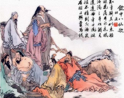 知章骑马似乘船,眼花落井水底眠。 汝阳三斗始朝天,道逢曲车口流涎, 恨不移封向酒泉。左相日兴费万钱, 饮如长鲸吸百川,衔杯乐圣称避贤。 宗之潇洒美少年,举觞白眼望青天, 皎如玉树临风前。苏晋长斋绣佛前, 醉中往往爱逃禅。李白一斗诗百篇, 长安市上酒家眠,天子呼来不上船, 自称臣是酒中仙。张旭三杯草圣传, 脱帽露顶王公前,挥毫落纸如云烟。 焦遂五斗方卓然,高谈雄辩惊四筵。 ![]() 【诗文解释】 贺知章酒后骑马,晃晃悠悠,如在乘船。他眼睛昏花坠入井中,竟在井底睡着了。汝阳王李琎饮酒三斗以后才去觐见天子。路上碰到装载酒曲的车,酒味引得口水直流,为自己没能封在水味如酒的酒泉郡而遗憾。左相李适为每日之兴起不惜花费万钱,饮酒如长鲸吞吸百川之水。自称举杯豪饮是为了脱略政事,以便让贤。崔宗之是一个潇洒的美少年,举杯饮酒时,常常傲视青天,俊美之姿有如玉树临风。苏晋虽在佛前斋戒吃素,饮起酒来常把佛门戒律忘得干干净净。李白饮酒十斗,立可赋诗百篇。他去长安街酒肆饮酒,常常醉眠于酒家。天子在湖池游宴,召他为诗作序,他因酒醉不肯上船,自称是酒中之仙。张旭饮酒三杯,即挥毫作书,时人称为草圣。他常不拘小节,在王公贵戚面前脱帽露顶,挥笔疾书,若得神助,其书如云烟之泻于纸张。焦遂五杯酒下肚,才得精神振奋。在酒席上高谈阔论,常常语惊四座。