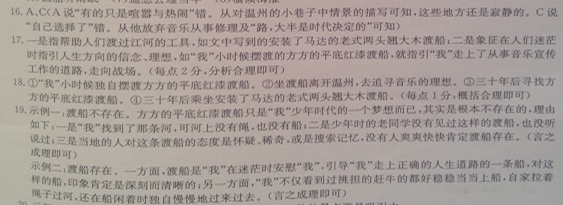 渡船 林斤澜 我离开温州三十多年,有时候会忽然梦见渡船。 有几年我住在蝉街外婆家里,蝉街不一定因蝉多得名,整个小城都在蝉声中过三伏天。蝉成日喧叫,但它悠悠的单调的声音,却浸透了寂静。 春天时节,绵绵的春雨空档里,漏下黄黄的阳光,我会忽然心慌起来,这种心慌,土话叫作“摇翼”,很形象。我一“摇翼”就赶紧跑出去,跑出悠悠的寂静去。跑出了三角门,跑过“存厂”,穿过田野,来到城外淡绿的河边,河面上横着一条粗绳,绳下一只红漆渡船,方方的平底的渡船挑担的赶牛的都好稳稳当当上船,自家拉着绳子过河。船常常闲着,我独自慢慢地过来过去。离开温州前几天,特别去坐渡船。离开是有目的地,但是千里迢迢,战火漫漫,没有一点把握实际还是个小孩子的心,觉得渡船渡到河中央,就好比到了生身之地的怀抱中间,心就静定下来,暗暗朝拜音乐女神,誓不变心。 去年我回到温州,住在松台山下的华侨饭店,当然是新楼,有水电,有沙发,有卫生间,有屋有堂有花圃。松台山脚还有个居高临下的剧院,晚上要仰起头来看电光灯。蝉街的河没有了和闹市五马街连接起来。城墙和三角门早就扒平了,我顺着马路走到城外,城外还是马路,“存厂”变成了工厂。马路的背后,寻着了田野,寻着了河,但河上没有绳,没有渡船,没有平底的方方的红漆渡船。 有回过一条江,渡船是只老式两头翘大木船,安装了个马达。拎菜篮的,背书包的,拿着篮子的老人家,一会儿站满了船舱船头。有一个十七八岁的女孩子,裤脚卷到腿肚那里,肩上背枪一样一条空扁担,扁担头上缠着空口袋。大家好像都认识,有人笑着说:“钞票赚着了。”女孩格格一笑,把头一扭,眼睛里的得意闪电一样。满船是多年思念的乡音,满船是思念里没有的说话“钞票,钞票”,“赚着,赚不着”……四面的人声里,忽然有一个低音撞到我耳朵里,碰着我不晓得哪一条筋,一个名字跳了出来,我冒叫一声,两声……一个白发苍苍,瘦脸黑黑的人站在我面前一分钟以后,两人都认出来是三十多年前的老同学。他的低音浑厚,当年他的本事是从上衣兜里抓出一支笔,有时甚至是一把牙刷,就指挥我们唱起响亮的“枪口对外,齐步向前!” 我们真真肩并肩走向战场。“我是海岸的哨兵”,“拿起鸟枪、铁锤、剪刀、石头、火炮……想象中,我们和日本鬼子巷战,肉搏,白刃相见。 我问他这些年在干什么呢?他说修理单车摩托直到拖拉机。他说他过了青年时期,才明白自己秉性不爱活动,根本也不是音乐材料。 他转过头去看江水,好像在问,当年的路是自己选择的吗?那时候自己会选择吗?同学朋友一个个不像浪连着浪吗?一个个叫浪推着走,叫浪卷进去了……路,大半是时代决定的。 不过我还是想我那条小河上的渡船,拉着河面上的粗绳到了河中央,祈求养育我的大自然,给我启发,帮我下决心。我打听哪里还有平底的方方的渡船。 他惊讶起来,用眼角睃着我说,从来没有见过这样的渡船,也没听说过,怎么会有四方的船呢? 刹那间,他疑心我做梦,我疑心他健忘。 我常常从松台山下,走过蝉街五马街。一路人撞人,从人缝里插过去,耳朵边嗡嗡地全是乡音,不过一个人也不认识。乡音满街满城,好比潮水,带泥带沙带泡沫带残渣的浑沌沌的潮水,我不熟识。 立刻从大街转进小巷,走石板路,推开油漆剥落的双扇前门,或是单扇白木变黑了的后门,走进潮湿的院子,走上苔藓镶边的石阶,走进幽暗的厢房,或是楼板晃晃的楼房,坐下来喝新鲜的绿茶,吸红牡丹香烟,和老朋友悠悠闲谈。 但方方的平底的红漆渡船呢,没有人爽爽快快肯定有过,多半是怀疑,是稀奇,是搜索记忆。我也糊涂起来了,莫非把庄子的方舟,或者圣经的方舟,掺杂到多年的乡思里去了。 我多住了些日子,认识了一些青年,我听见三四苯并芘、信仰危机、意识流、蒙太奇……这都在小巷里的斗室里,好比水潭,这里有寂静,有清澈,有深沉,有“摇翼”的心慌,有明天的梦。 我又离开温州时,更加相信过去有过方舟,挑担的赶牛的都能够稳当站着过河,也站过心慌的少年。 我相信现在也会有,只不过一时说不清在哪里。方方的平底的红漆渡船呀,我还要寻你,也许明天就会心慌起来,千里迢迢回去寻你。 16.下列对文章有关内容的赏析,不准确的两项是(4分,两项都对得4分,答对一项得2分,有错项得0分) A.三十年前的温州显得较为寂静,而三十年后的温州却发生了巨大的变化,不再有昔日的寂静,有的只是喧嚣与热闹。 B.“我”小时候有“摇翼”的心慌,反映出“我”当时内心对人生道路的迷茫,而恰恰是城外河上的渡船给了“我”坚定的信心。 C.“我”在温州偶遇老同学,他和“我”一样在三十年前自己选择了一条从事音乐的人生道路,他指挥“我们”演唱过抗日歌曲。 D.“我”认识了一些青年,听见三四苯并芘、信仰危机、意识流、蒙太奇,这从青年追求新事物方面展现了温州的变化。 E.文章以“渡船”为线索叙事,从三十年前写到三十年后,重点写作者三十年后对心中渡船的找寻,前后呼应,结构严谨紧凑。 17.“渡船”有着怎样的含义?请结合全文简要分析。(4分) 18.本文写了“我”哪几件与渡船有关的事?请简要概括。(4分) 19.“我”找不到渡船,有人说这渡船不存在,有人说渡船被人们遗忘,你对此有何看法?请结合全文谈谈你的认识。(8分) 参考答案