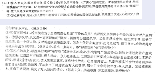 雪白的鹦鹉 胡也频 近于薄暮的时候,残照的余辉映到游廊上,鹦鹉的雪白毛羽上披了淡淡的红光,感着快乐似的在架上跳着。 它看见来了一个人影,便叫起来了:“来客咧……” 少年站到游廊的一边,看着这鸟儿。这时,一种新的感想便拢住他,使他不禁的凝望着,发了许久的呆。随后他走开了,心里还不住的这样想:“可怜的鸟儿……毛羽这样纯洁……却锁在钢架上……” 鹦鹉还在叫,而少年已走进一间房里了。那里面,电灯的光灿烂着,点亮着装饰华丽的四壁,一个银铸的“寿星”在横桌上反吐出白光;一切的器具都有一种夺目的色彩。两个年轻的女子便仓皇地像回避生人似的站起来…… “一家人……”坐在她们对面的老头看清了走进来的人,便这样说,于是她们又坐下了。 “你从那里来?”他问。 “从妈那里。”少年沉静的回答;他站到一只花盆架前面,抖开手巾去揩那流出的鼻水。 “怎么,你受了凉?”老头子关心地诧异地问。 “大约是吧。” “那末,吃一点姜茶——”一个女子便亲切的插口说。 “对了。你吃过没有?” “不,”少年只是机械似的回答,“不用。” 过了一会,老头子偏过脸,感慨而喃喃地说:“你还是这样的固执……” 少年便转过身来问,“爸爸,你说的是我不吃姜茶么?”说完,便又玩着天冬草。 “流鼻水,又不吃姜茶,这固然是你固执……但是我说的不是这件事。” “你说的是我的婚事么?”少年冷静地问,并不转过脸。 “虽然……然而我也不愿说。你呢,在北京读了几年书,现在变得什么都不如你的意。你是一个新人物!我呢,年纪老了,老年人自然免不了有别的看法,不过——若说到你的婚事,我无非是替你着想:自由结婚的人常常马上又离婚了……不,我现在不说。”老头子一面说,一面便慢慢地红起脸。因为他的儿子不作声,便又接着说:“你做小孩的时候多可爱……不,这也不说!我不是说你现在有什么不好……你想,家里面还有钱,至少过这一辈子也足够,何必做什么——你一年到头行踪不定,像一个叫化子。你冷笑什么呢!……自然,我也知道,现在像我这样的人,也是你要打倒的!……”这老头子越说越激昂起来,终于那半白的胡须在鼻尖下颤动了。 “唉一——”老头子还愤愤地说,“我已经成为老朽了,谁知道还能够再活多少日子……” “不要这样说,爸爸!其实你是很有福的,住在这样好的别墅里,并且还有两个……世界上找不出许多像你这样的人。” “你又在骂我?”老头子闪起眼光。 “一点也没有这意思。” 于是两个人便默着。这沉默一直拖延下去,到了一个仆人进来请吃夜饭的时候。 鹦鹉还在叫:“来客咧……” 在非常明澈的月光下,少年现着异样苦闷的脸色,缓步地循着那鹅蛋石的曲径,走到了挂着鹦鹉的游廊边…” “来客咧……”鹦鹉又叫起来了。 他站住,好生感慨的看着这鸟儿。月光正软软地射着毛羽,鹦鹉显得柔润而且放光,使人会想到神话中的美的天使。 “然而你依然是一只可怜的鸟儿,”少年想,“丑的老鸦也比你自由得多了!”因而他想到那两。个青年的女子,他父亲的如夫人,不正像这只鹦鹉,三者是同一的命运么?他愤然了,一种同情心的鼓动使他做了这样的反抗: “飞去!人没有权利来锁住你!可怜的鸟儿,你已经有自由了!” 可是,那鹦鹉,那得了解放的鹦鹉,却弯起脚,拖开一只翅膀,感着失了习惯的那种不方便,而惊疑着。 “飞去呵!……”少年把手帕飘近了,鹦鹉便又吃惊起来,错乱的跳,又用脚来抓。 少年又懊恼着,他于是又悄悄地捉住了它,拿了一只扶梯,爬上去,把它放到满是绿荫的洋槐树的枝上。这鸟儿便站在那里。少年带着异样的快乐向着它微笑。 第二天,少年醒来时,将近中午了。阳光灿烂着,从窗上吹入了兰草的气味,他想起昨夜的事,觉得在他的眼前也居然现着一个光明的世界。 “那鸟儿一定很幸福呵,它或者就发生了它的恋爱……”少年带着美感,这样揣想。于是他起身到园里去散步。 “来客咧……”忽然他又听到这声音,当他走近那游廊的时候。他吃惊的举眼回顾,原来在那个黄钢架上,昨夜被他放走的那只鹦鹉又在那里跳着。 (有删改) (1)下列对小说相关内容和艺术特色的分析鉴赏,最恰当的两项是(5分) A.小说以鹦鹉的“来客咧”引出小说中的主要人物——少年,可谓未见其人先闻那“鹦鹉,,声,悬念顿生,使情节设置不令人感到突兀。 B.少年随着鹦鹉的叫声走进一间屋子,见到的是装饰华丽的四壁、光彩夺目的器具以及两个年轻的女子,显示其父亲生活的奢靡。 C.看见少年流鼻水,少年的父亲关心少年的身体,要他吃点姜茶,但是少年不肯,这使少年的父亲产生感慨,为少年不听话而伤心。 D.少年的父亲认为,少年在北京读了几年书,变得什么都不如意,一年到头行踪不定.像一个叫化子,希望他早点结婚,结束流浪生活。 E.少年放飞了关在笼子里的鹦鹉,感到快乐和幸福,这预示着少年的爱情自由最终会得到实现,即使结尾鹦鹉的飞回也不能“阻碍”。 (2)作品第一段的环境描写有什么作用?请简要分析。(6分) (3)作品中的少年有哪些性格特点?请简要分析。(6分) (4)作品为什么以鹦鹉的叫声结尾?结合全文,谈谈你的看法。(8分) 参考答案